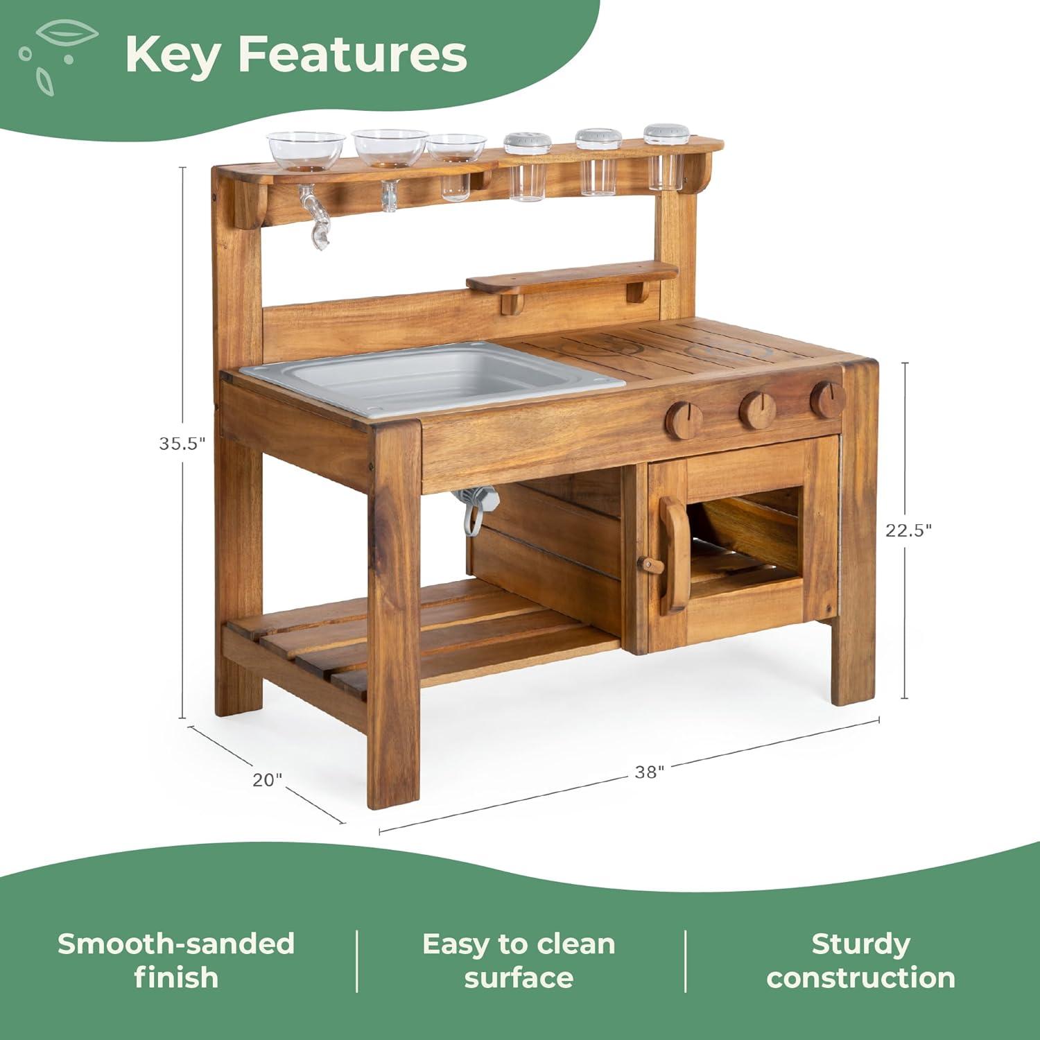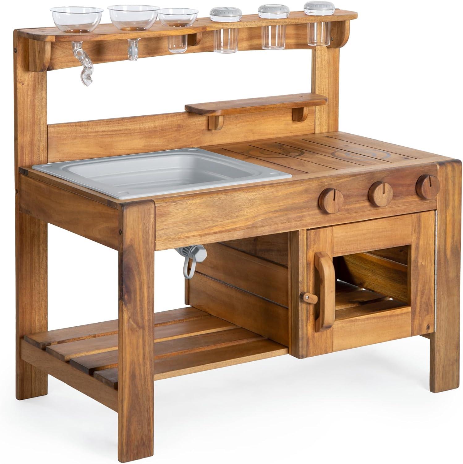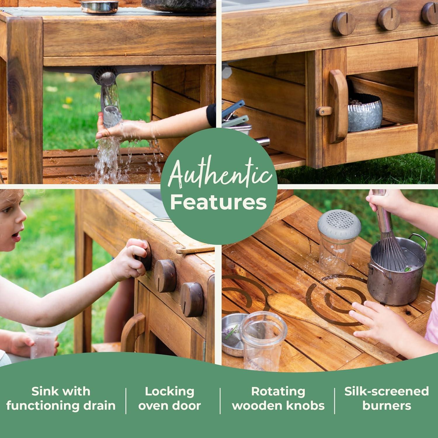OUTDOOR MUD KITCHEN FOR KIDS: This durable, wooden mud kitchen playset for kids is designed using weather-proof acacia hardwood, making it durable enough for continued outdoor play in backyards or school playgrounds.