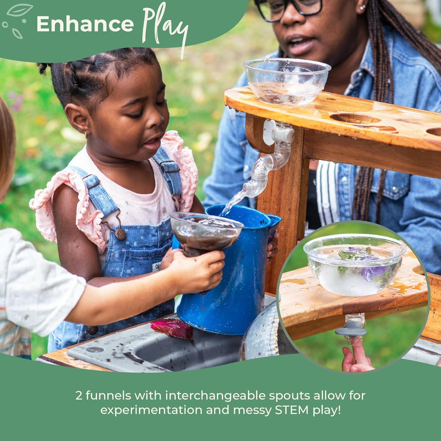 INCLUDES UNIQUE, EASY-TO-CLEAN PLASTIC ACCESSORIES: Set comes complete with 2 unique funnels to inspire exploration and STEM play, a scoop cup for use with messy materials like mud and sand, and 3 specimen jars with various lids.