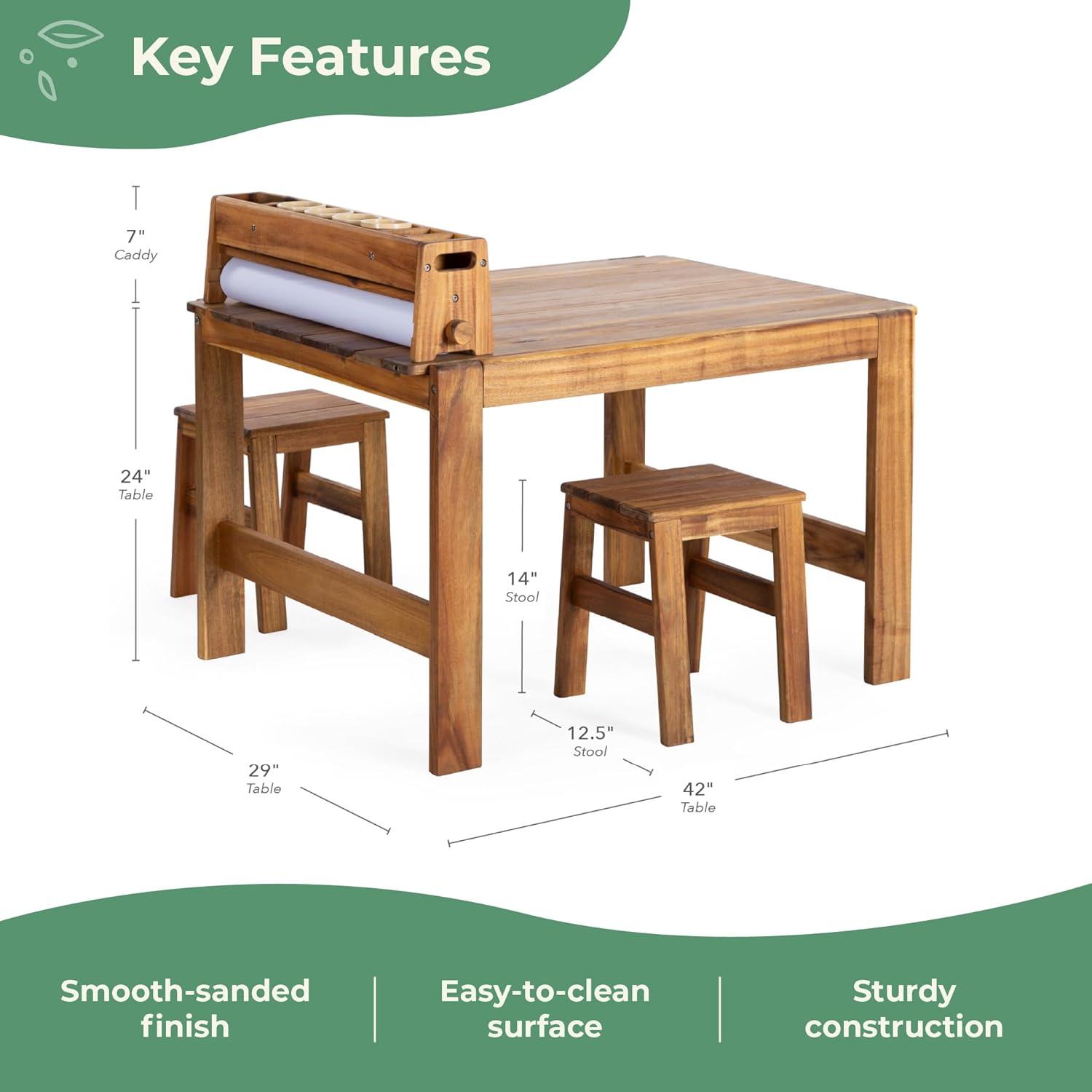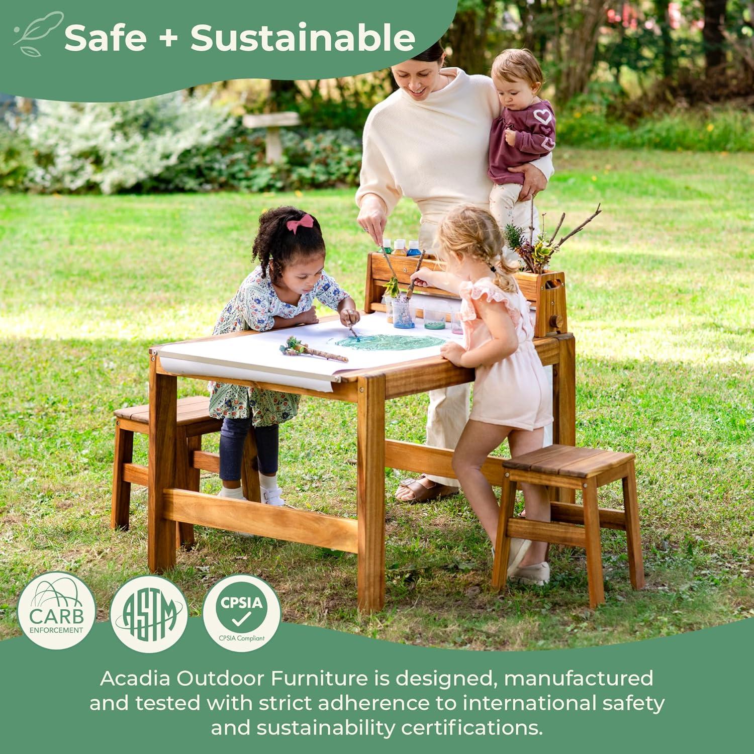 WEATHER-RESISTANT OUTDOOR ART ACTIVITY TABLE: Crafted from durable acacia hardwood with a protective finish, this kids' art table is built to withstand sun, rain, and moisture, ensuring long-lasting use outdoors. Its sturdy design provides a reliable space for creative play, messy projects, and even outdoor picnics, making it a versatile addition to any backyard or play area.