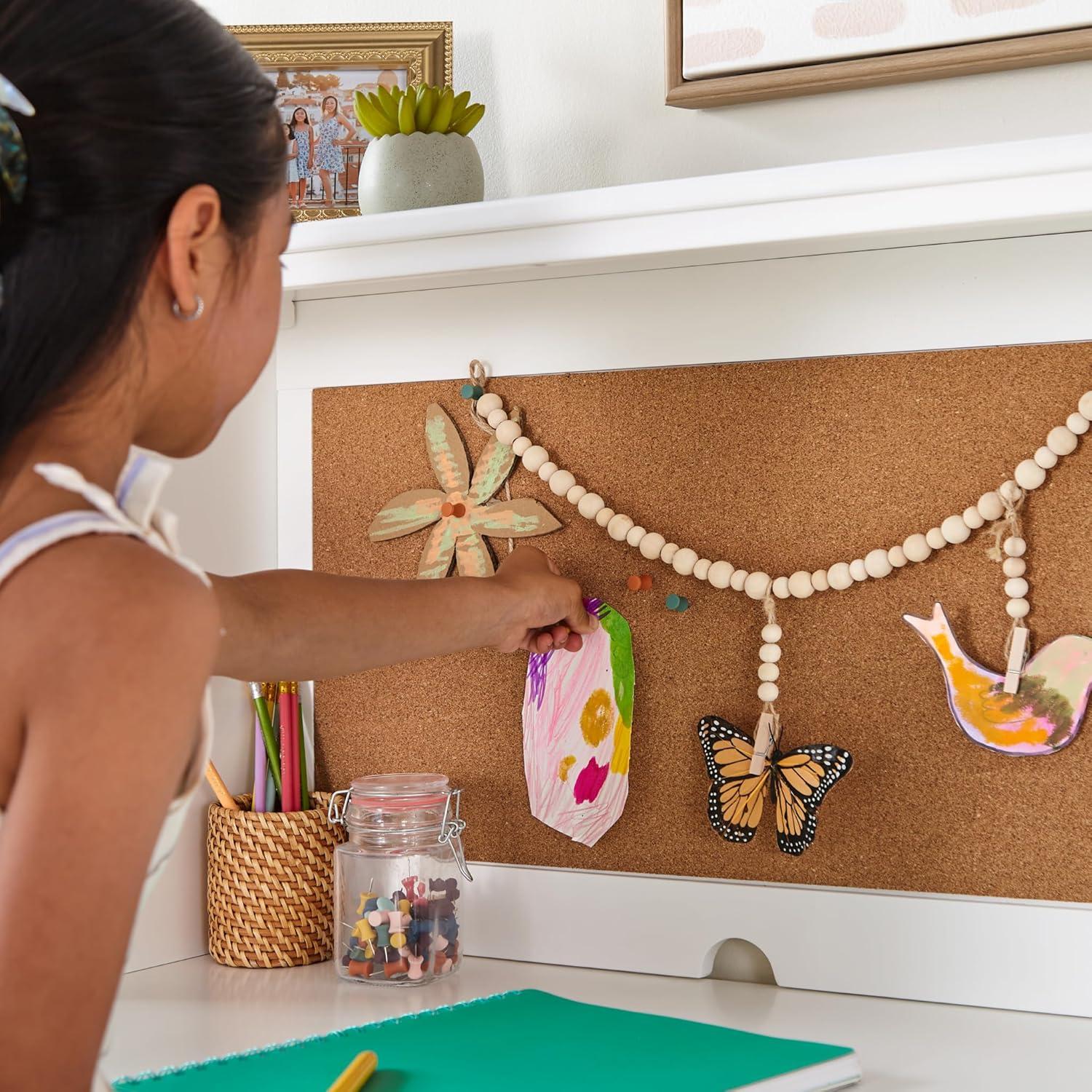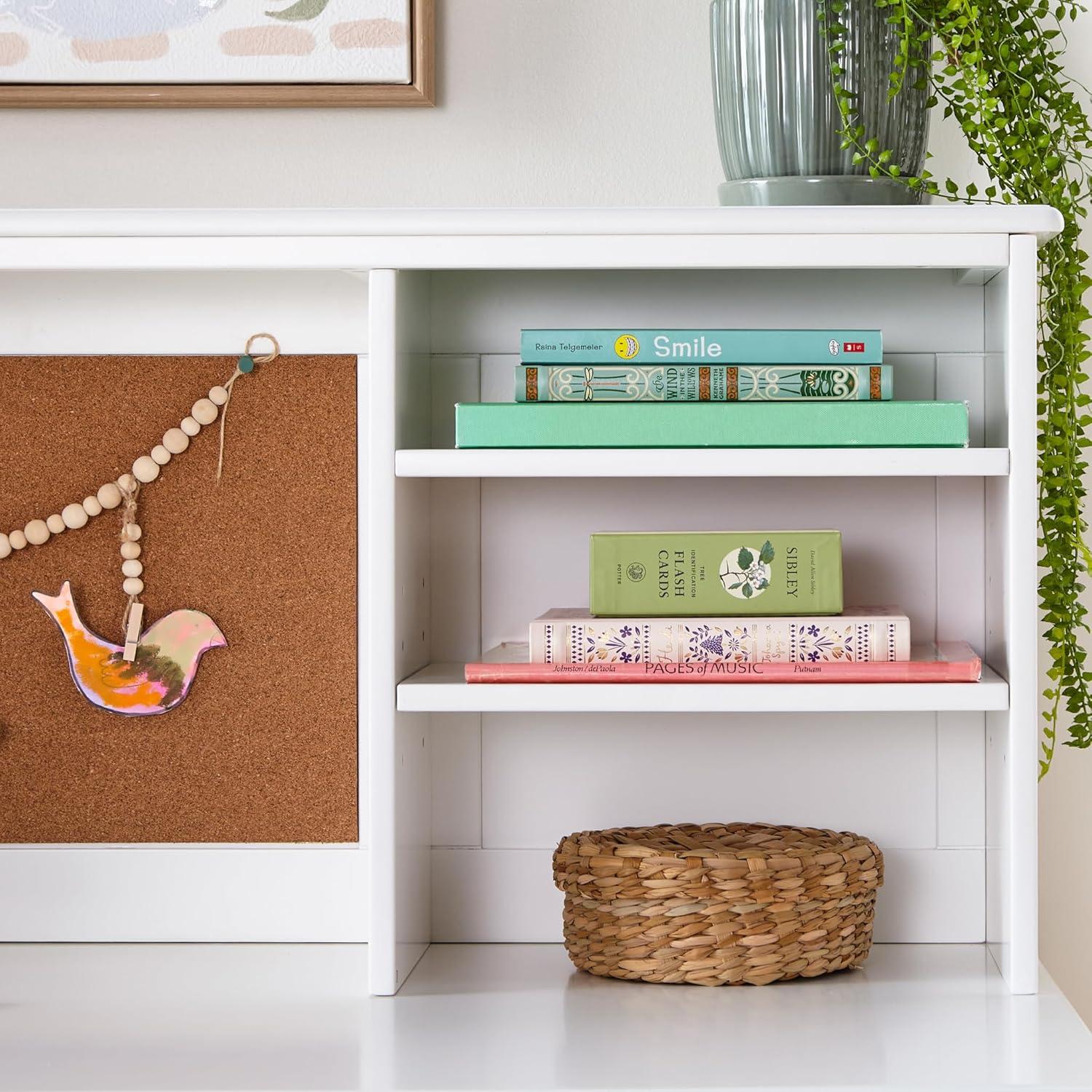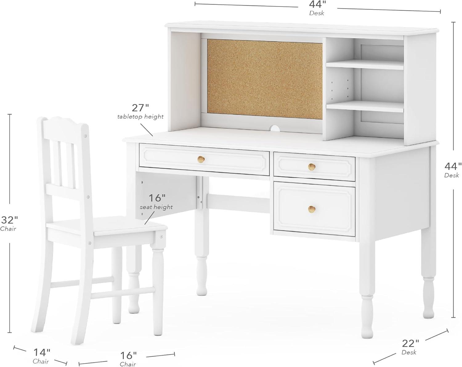 COMPLETE SET INCLUDES VERSATILE STORAGE HUTCH WITH CORKBOARD: Hutch features various storage shelves to keep book and learning supplies organized, as well as a built-in corkboard and a convenient cord cutout