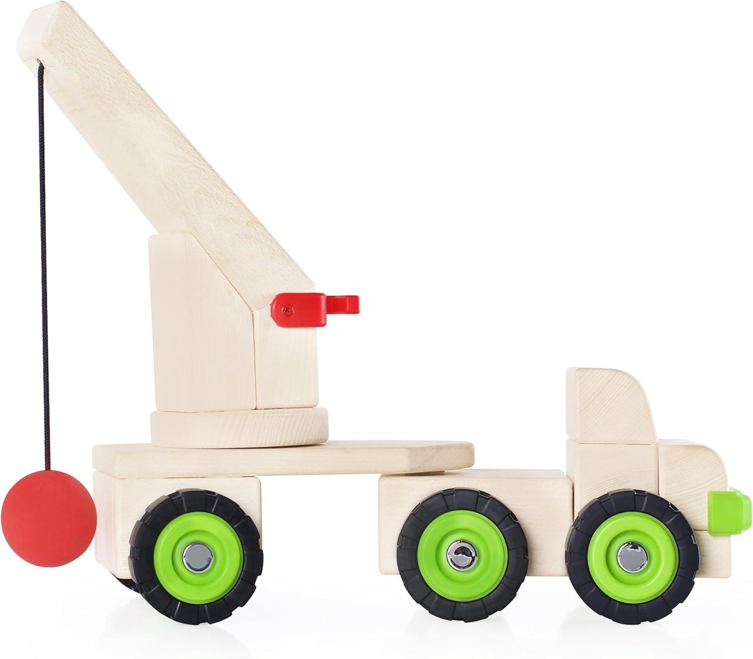 Crane rotates so a child can align the wrecking ball with their unit block structures, and articulating trailer allows the truck to make sharp turns.