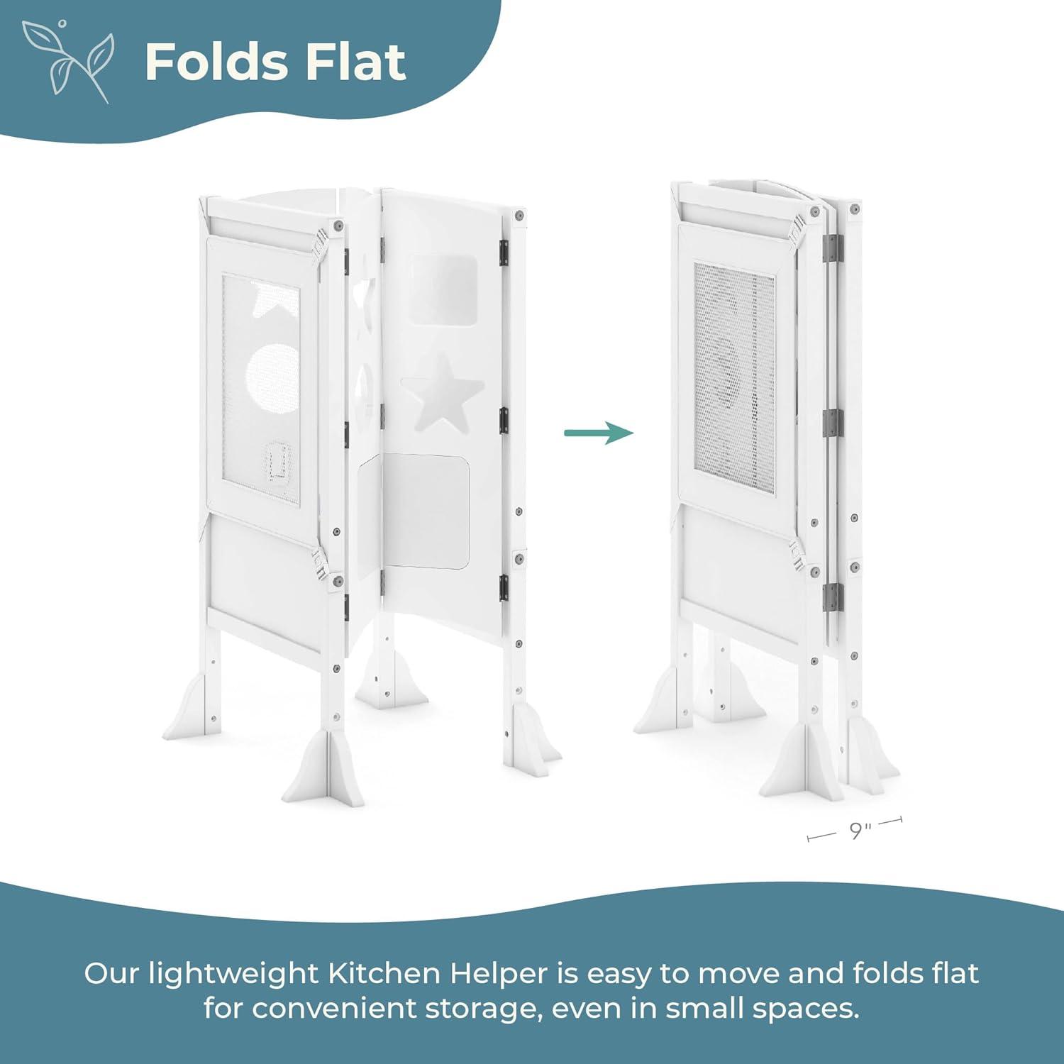 Guidecraft Classic Kitchen Helper® Folding Toddler Tower – Natural: Wooden Kids Kitchen Step Stool w/Safety Nets & Non-Slip Mat, Montessori Toddler Standing Tower | Adjustable Learning Stool for Kids(White)