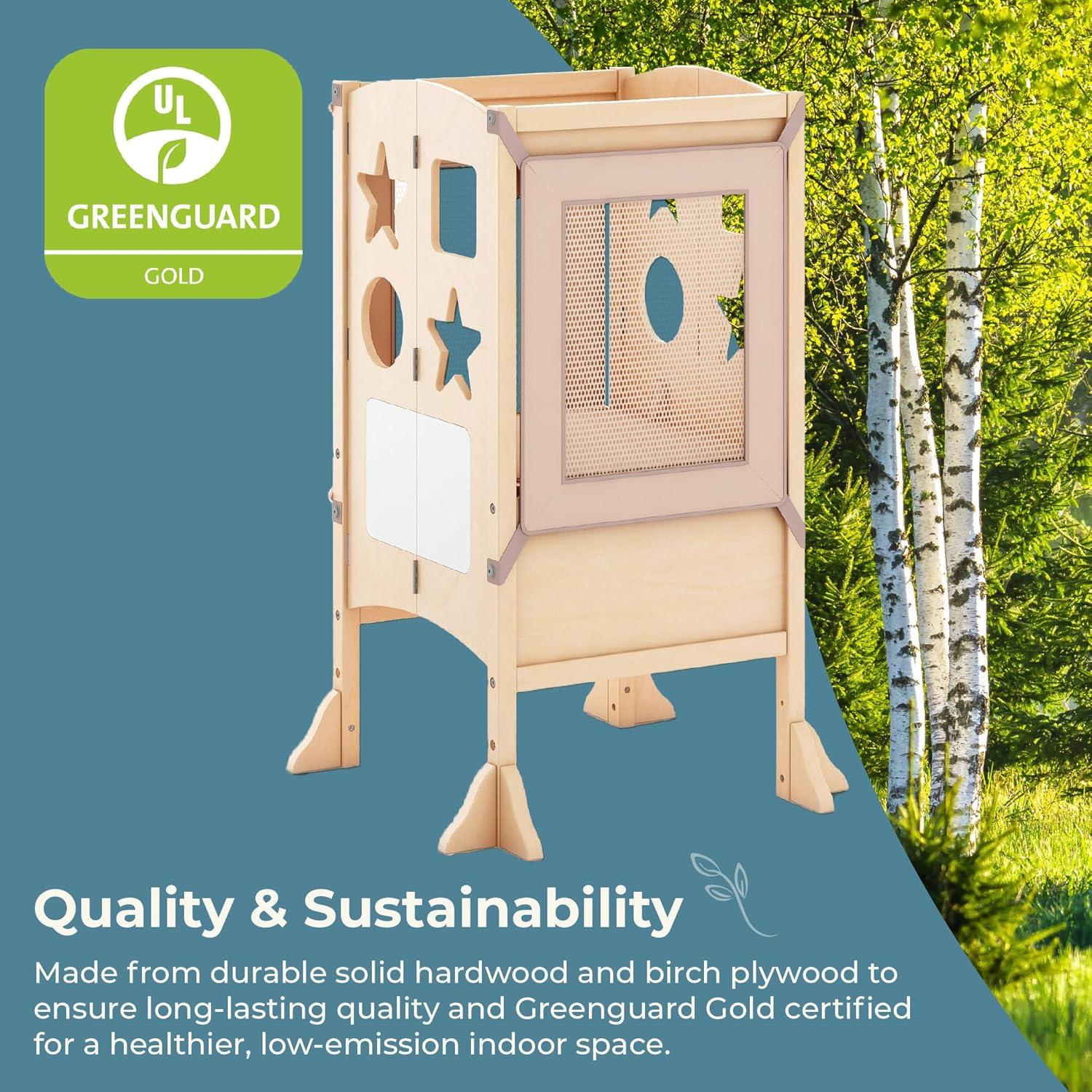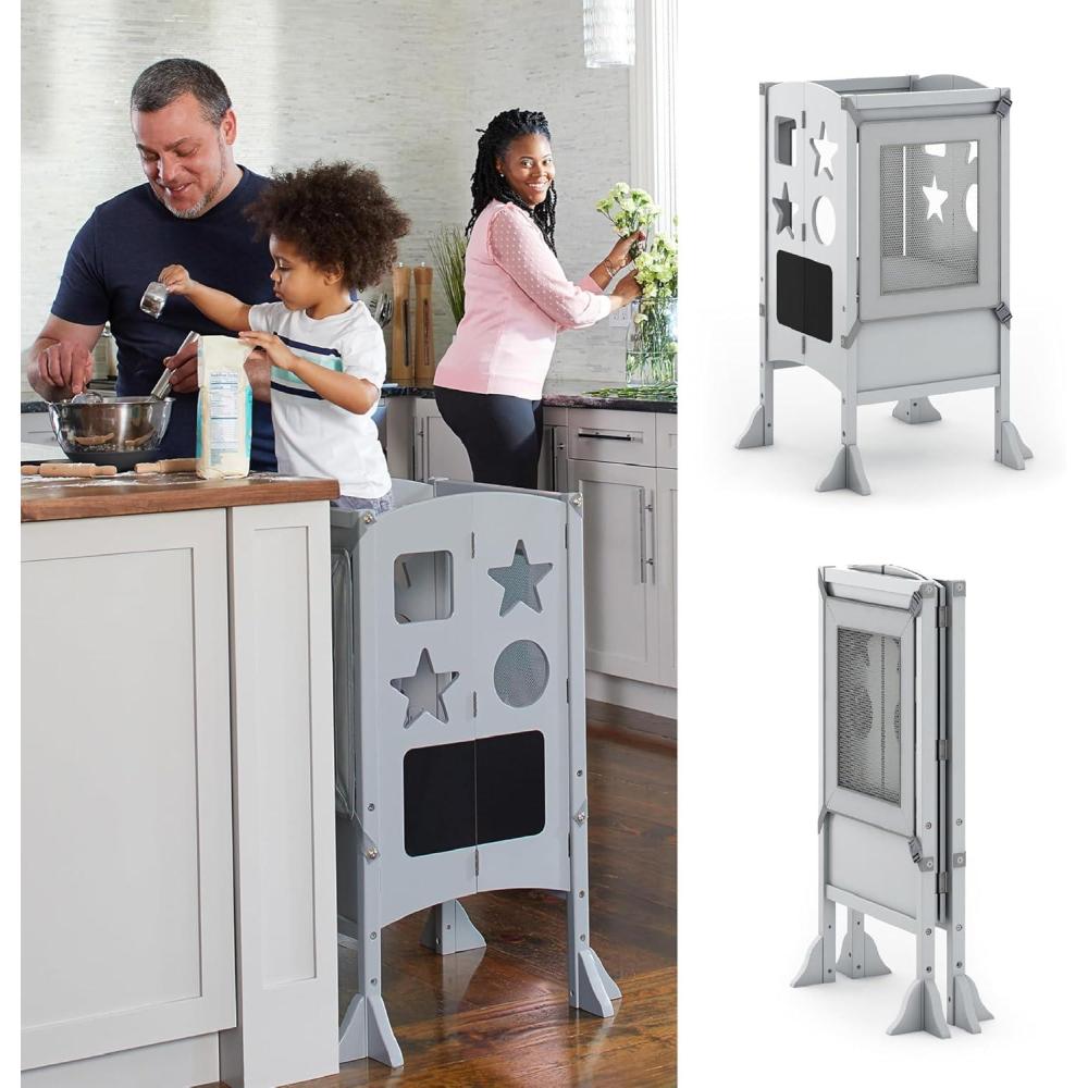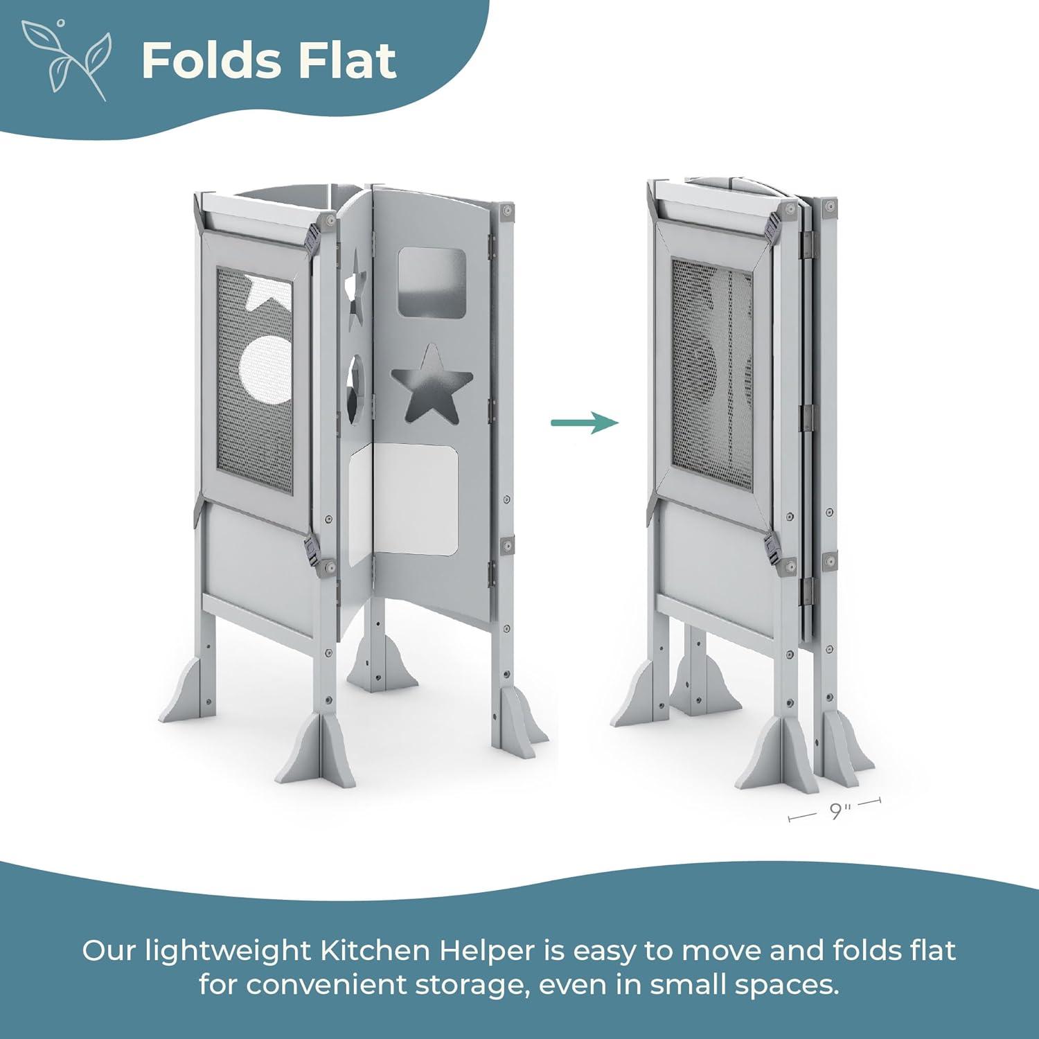 Guidecraft Classic Kitchen Helper® Folding Toddler Tower - Natural: Wooden Kids Kitchen Step Stool w/Safety Nets & Non-Slip Mat, Montessori Toddler Standing Tower | Adjustable Learning Stool for Kids(Gray)