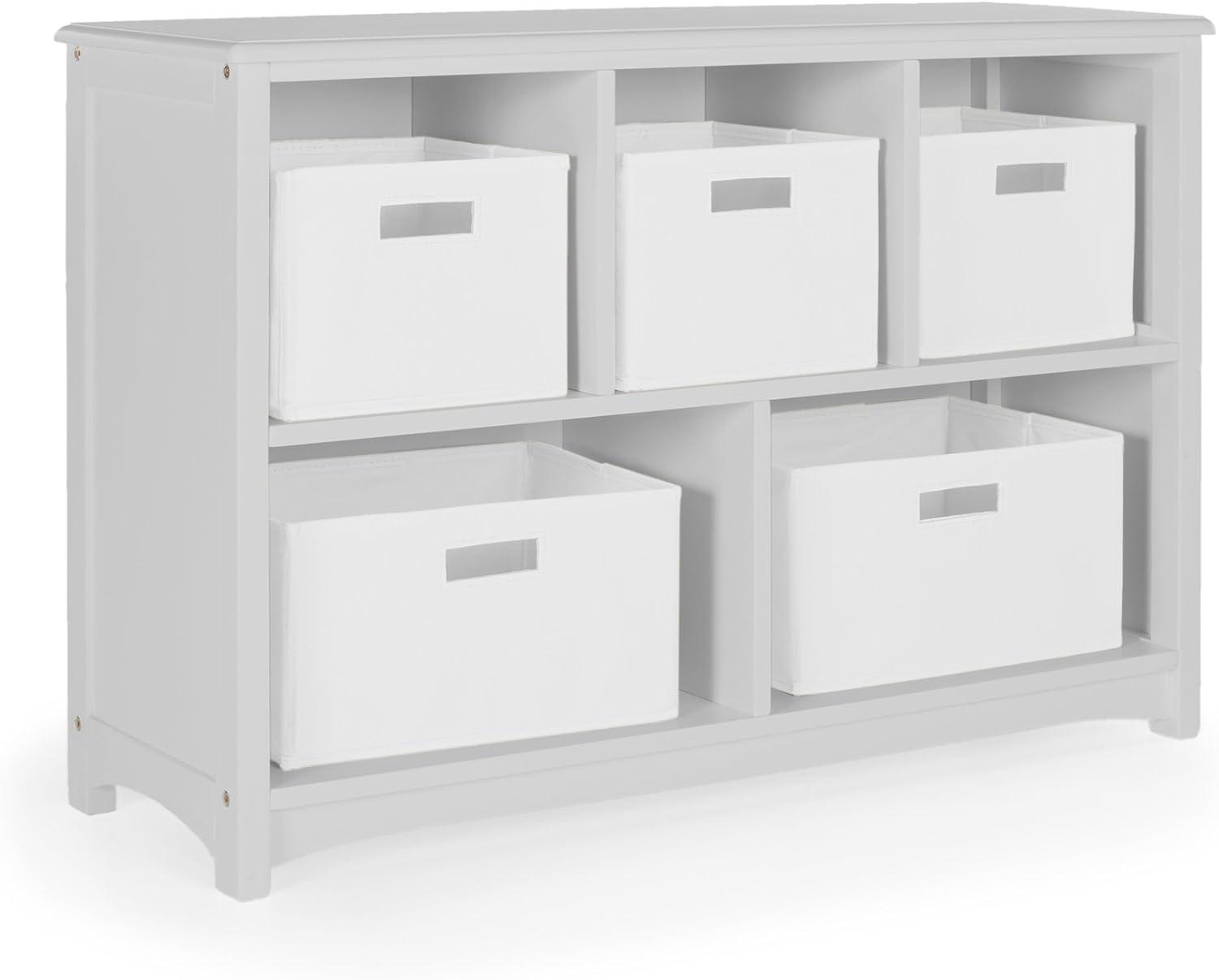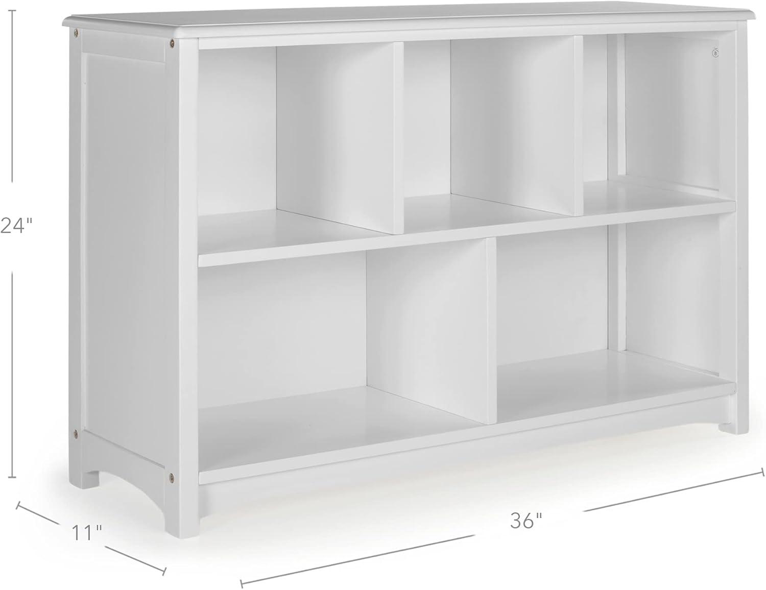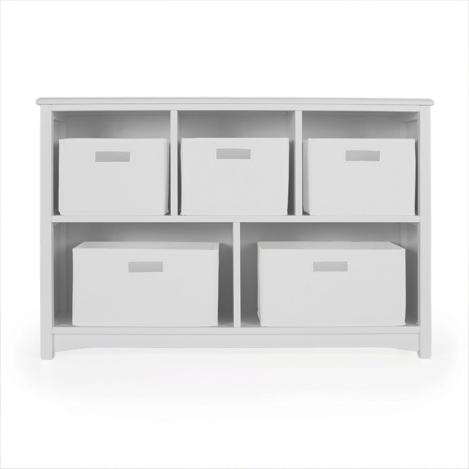FIVE LARGE STORAGE COMPARTMENTS: Bookcase features two deep shelves divided into compartments; bins not included