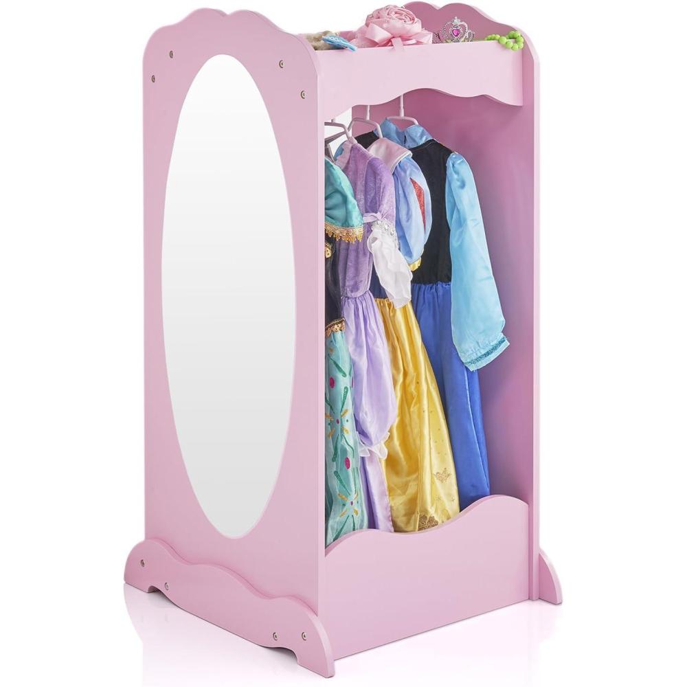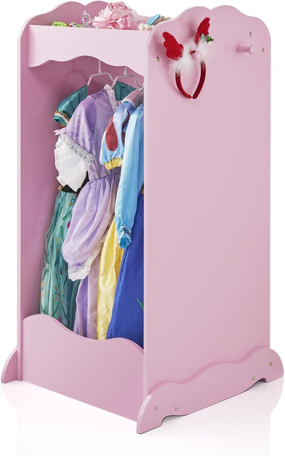 SPACIOUS STORAGE SPACE: The interior space easily accommodates all your child’s favorite outfits, while the top and base compartments are perfect for shoes, purses and crowns. Exterior knobs hold capes, hats, necklaces and other play accessories.