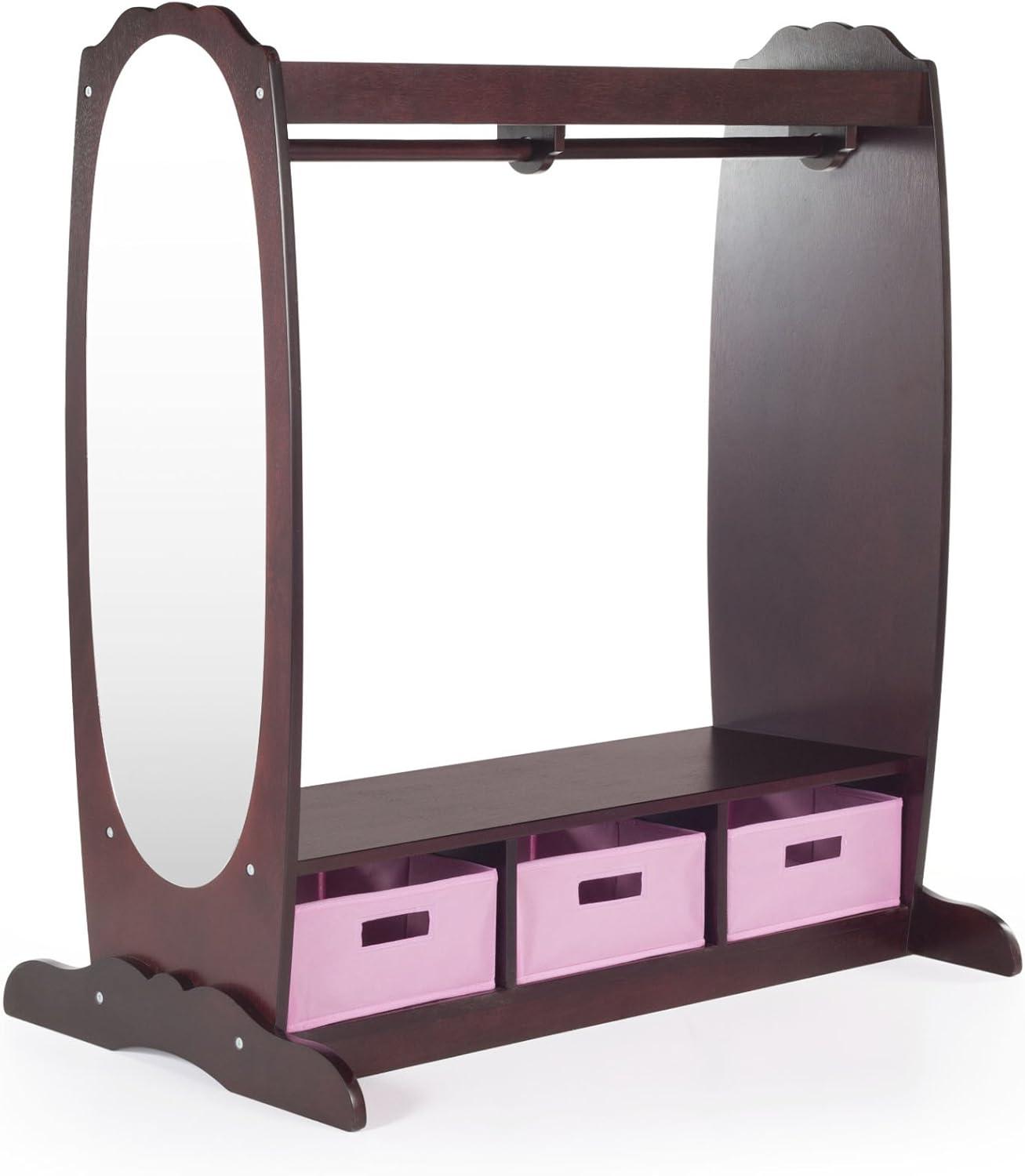 ENCOURAGE IMAGINATION WITH A HIGH-QUALITY DRESS UP CENTER: Features a long rack for hanging kids' clothes, an upper shelf, full-length inset mirror, and divided bottom cubbies with fabric bins.