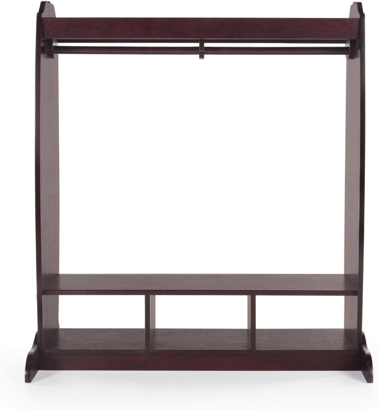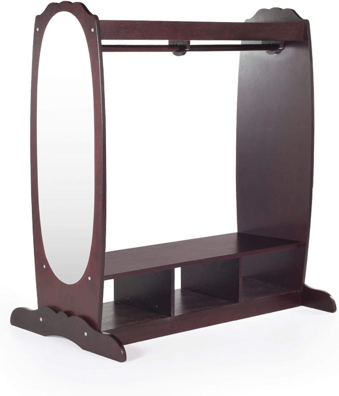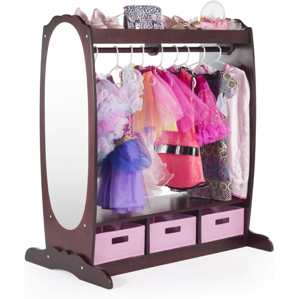KIDS' COSTUME STORAGE RACK WITH MIRROR AND FABRIC BINS: Organize costumes, clothes, shoes and pretend play accessories using this spacious wooden unit