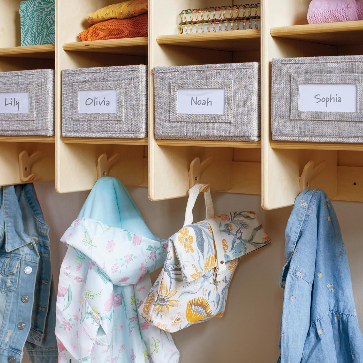 FEATURES DIVIDED COMPARTMENTS WITH BINS: Complete with divided cubbies, a large top shelf, plastic hooks for hanging coats, and fabric storage bins