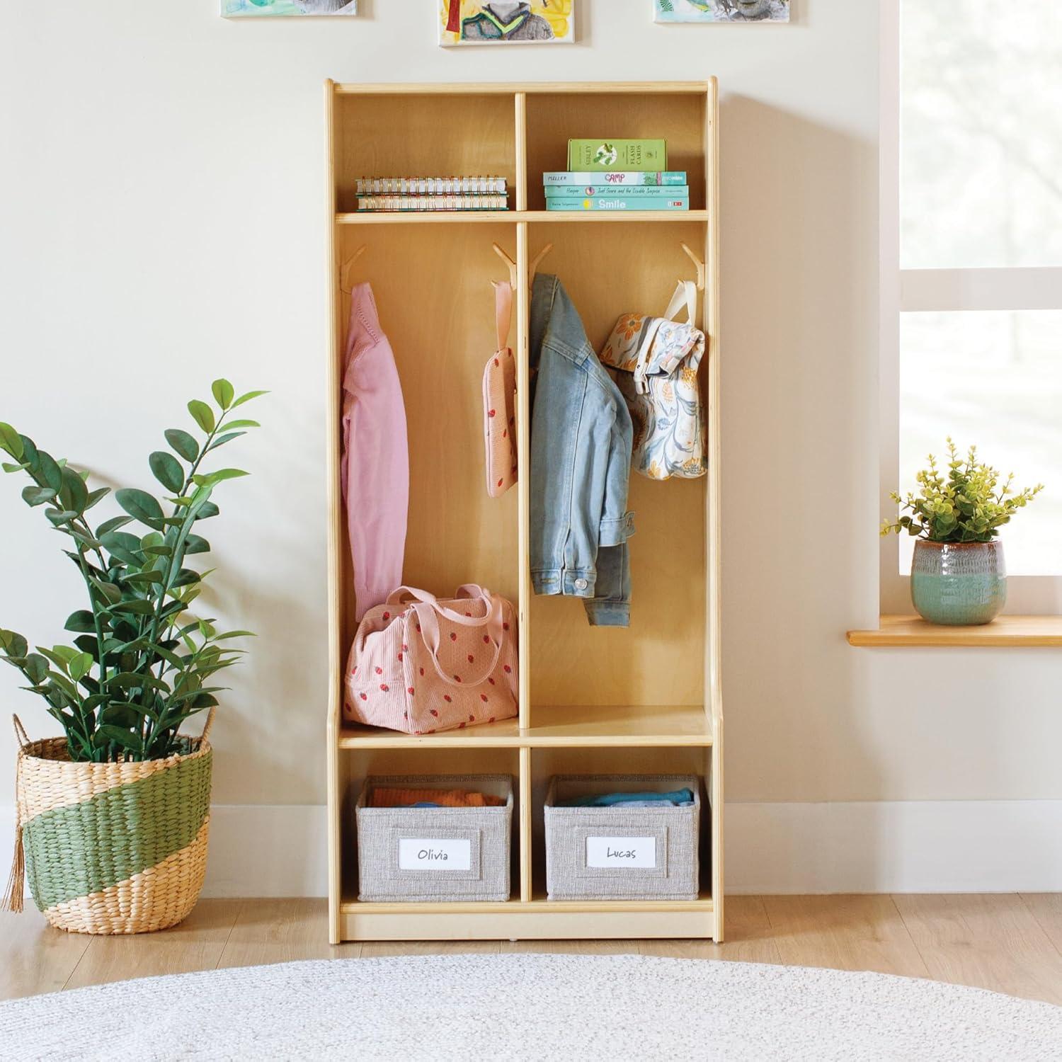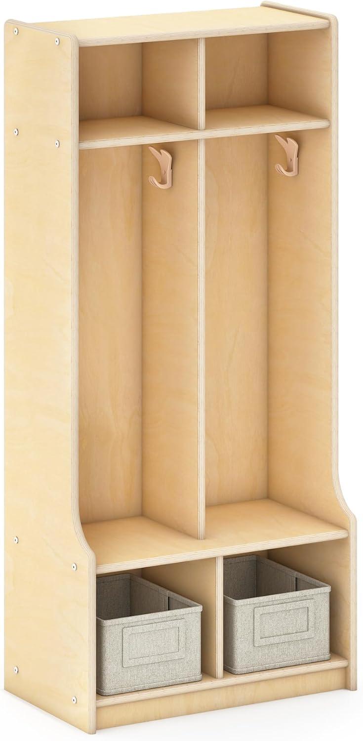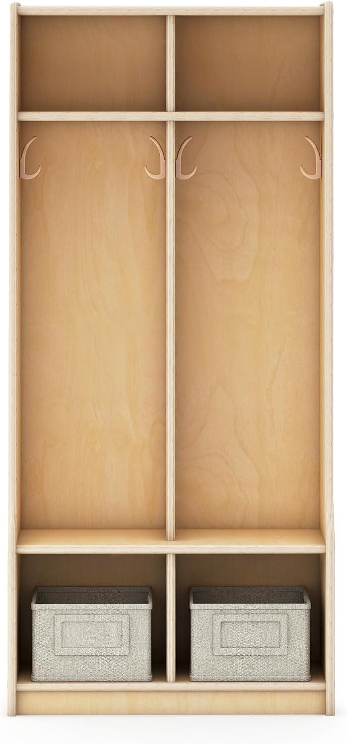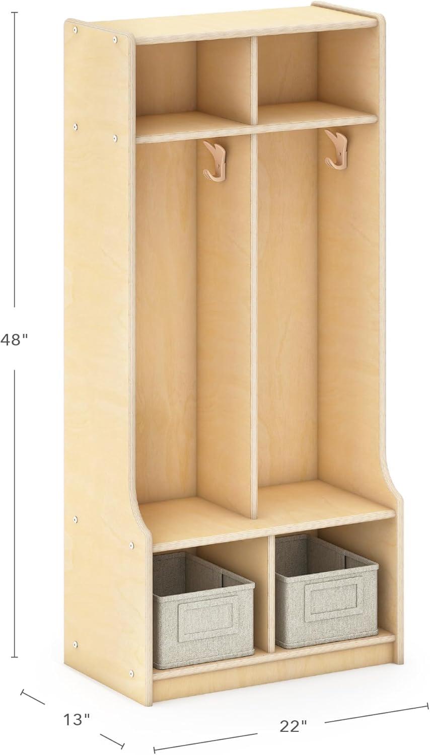 Guidecraft EdQ 2-Section Wooden Storage Locker with Bench Seat for Classroom, Kids Cubby Organizer with Shelves and Hooks for Coats, Divided Playroom Storage with Bins(Natural)