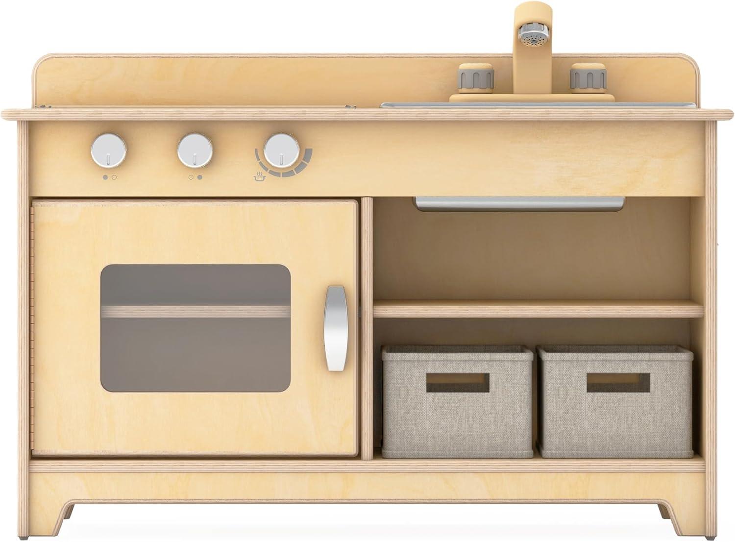 Guidecraft EdQ Kids’ Kitchen Stove, Sink and Oven Set - Natural: Wooden Montessori Kids’ Kitchen Playset, Pretend Play Toy w/Realistic Knobs, Storage Shelves & Bins for Dramatic Play Accessories