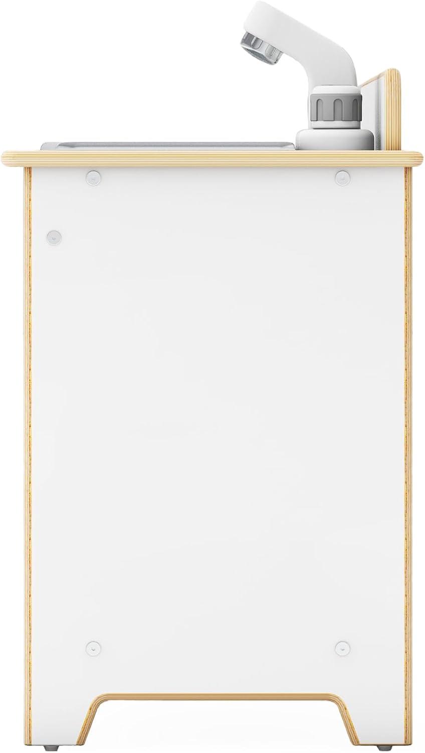 AUTHENTIC PLAY FEATURES: Silver-toned stovetop with acrylic-covered mirrored burners, interactive easy-turn metal knobs, and an oven with interior shelf for pretend baking and roasting. Coordinating the sink with matching faucet and removable bin makes pretend cleanup a natural part of play.