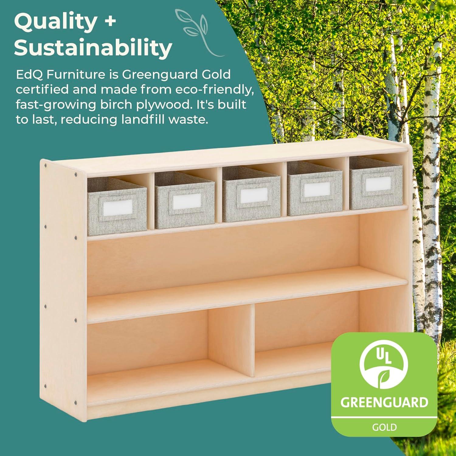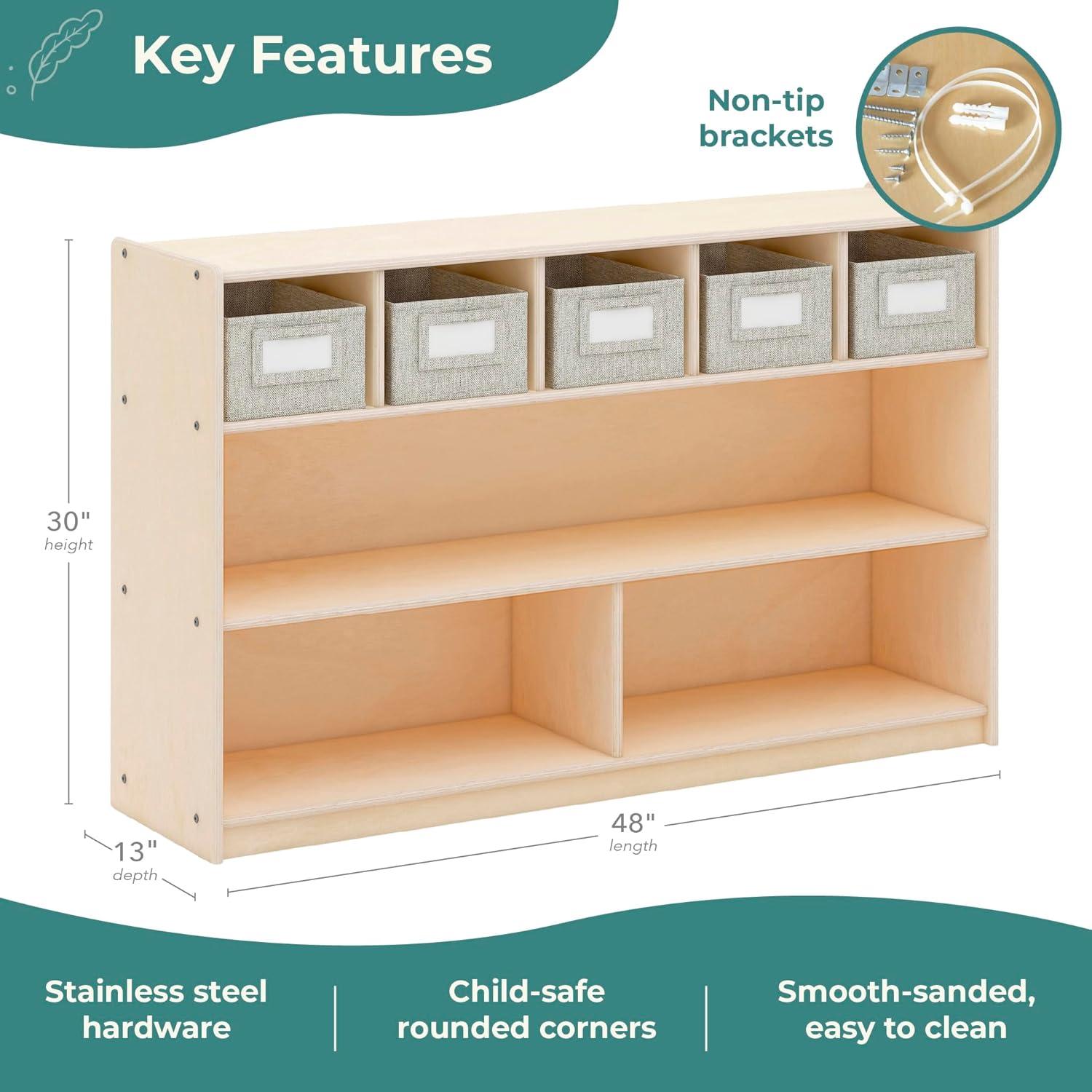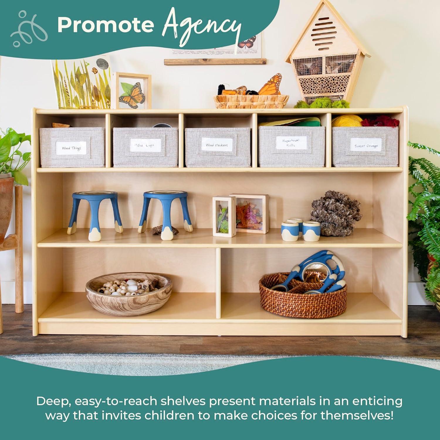 FIVE FABRIC BINS INCLUDED: Keep toys, learning materials and books organized; each bin measures 8″W x 11″D x 5″H