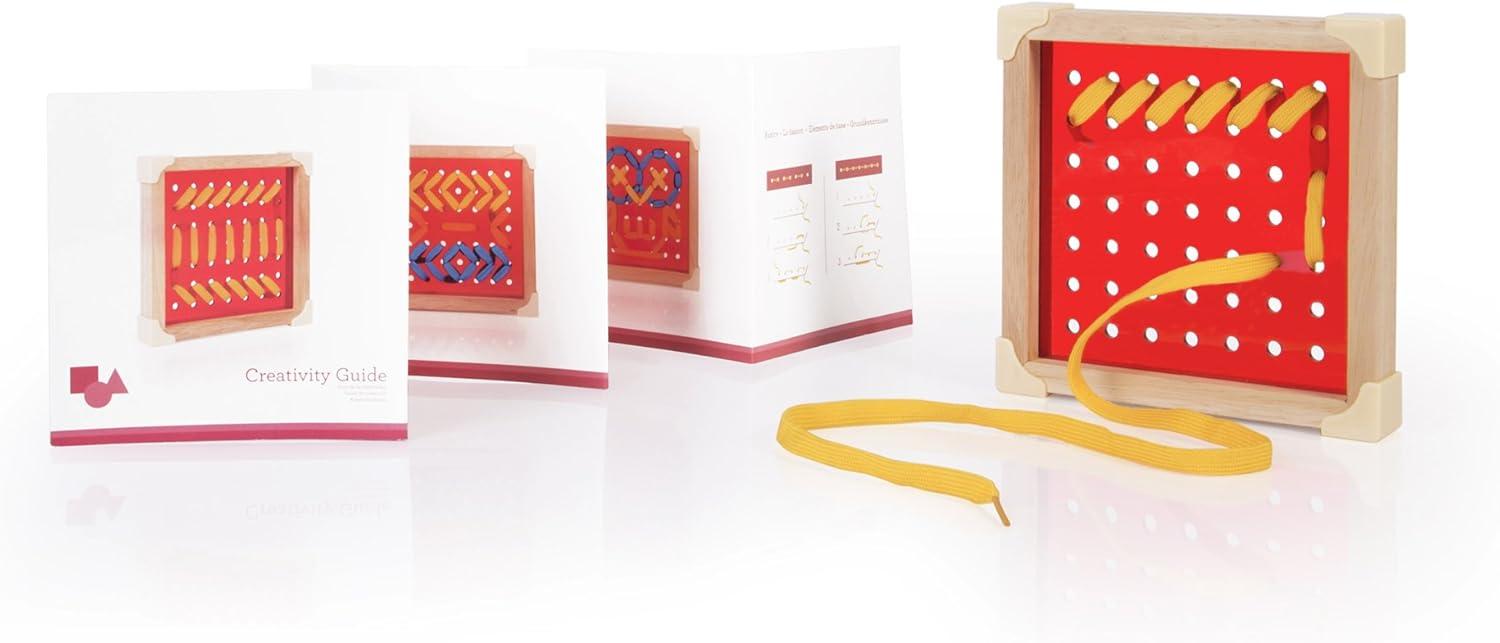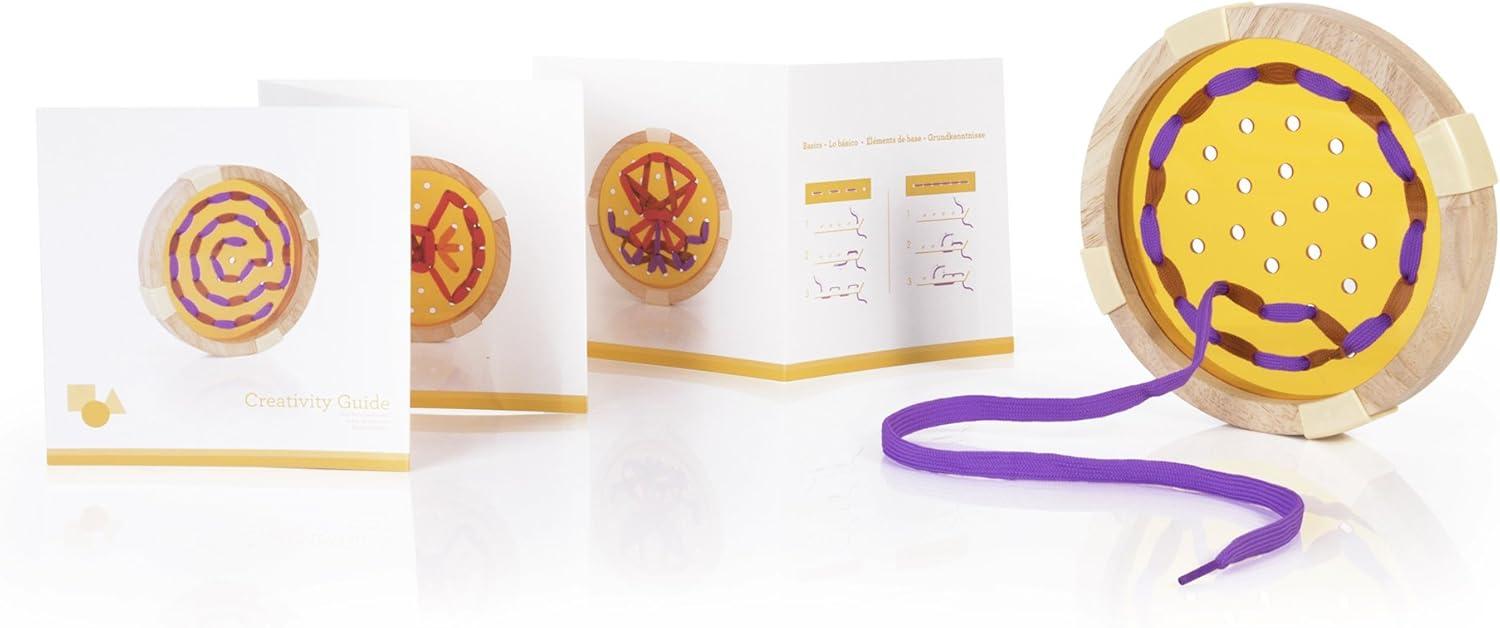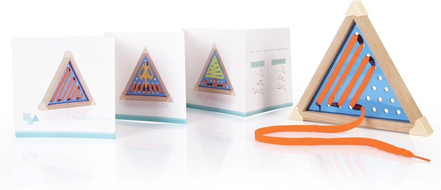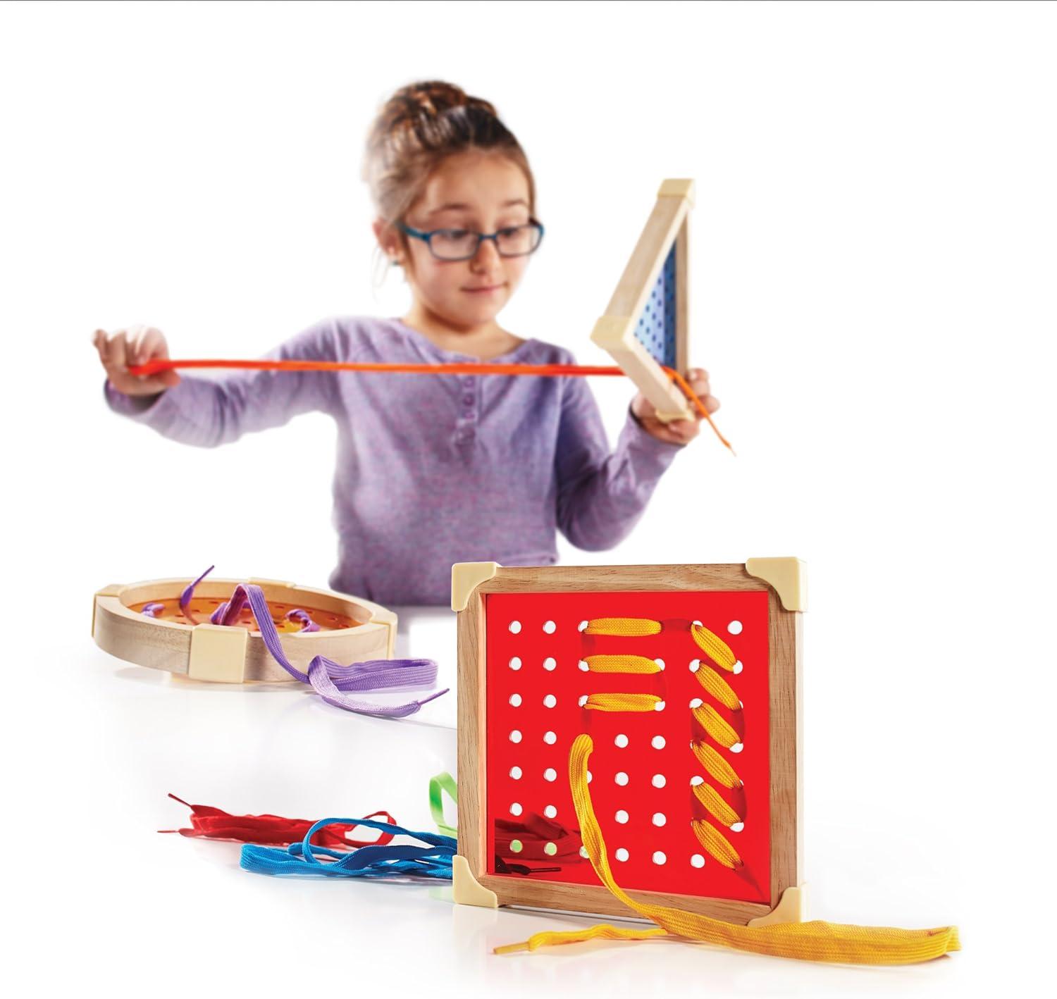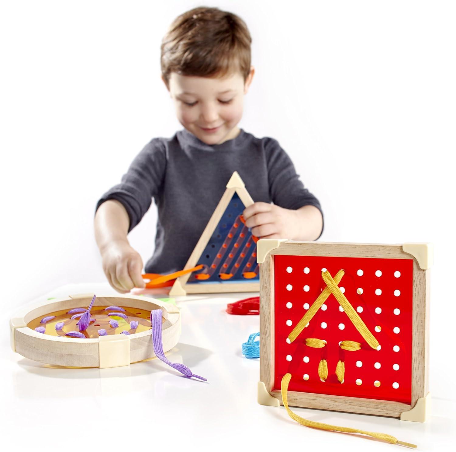 Geo Shape Lacing set includes a square board, triangle board, and a circle board, and 6 multi-colored laces.