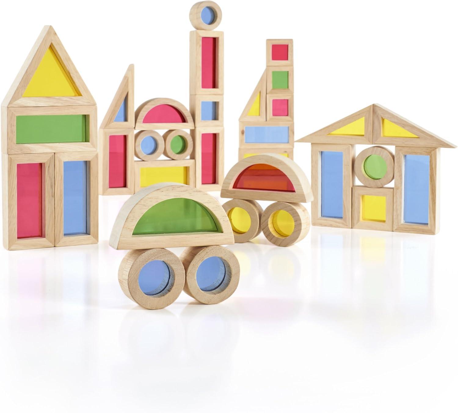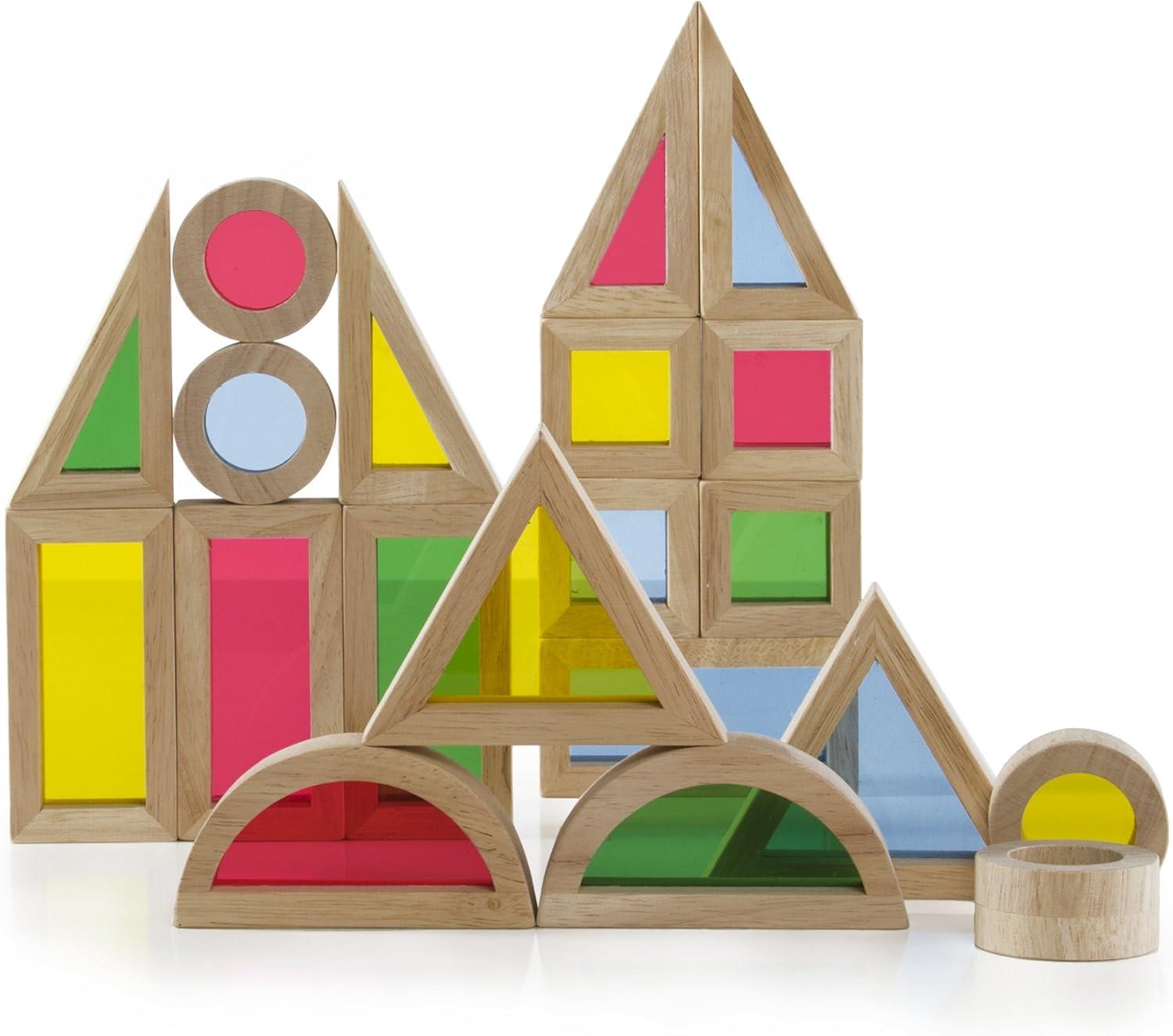 Set includes 40 assorted shapes of solid wood frames with inset colored acrylic windows for ages 2+