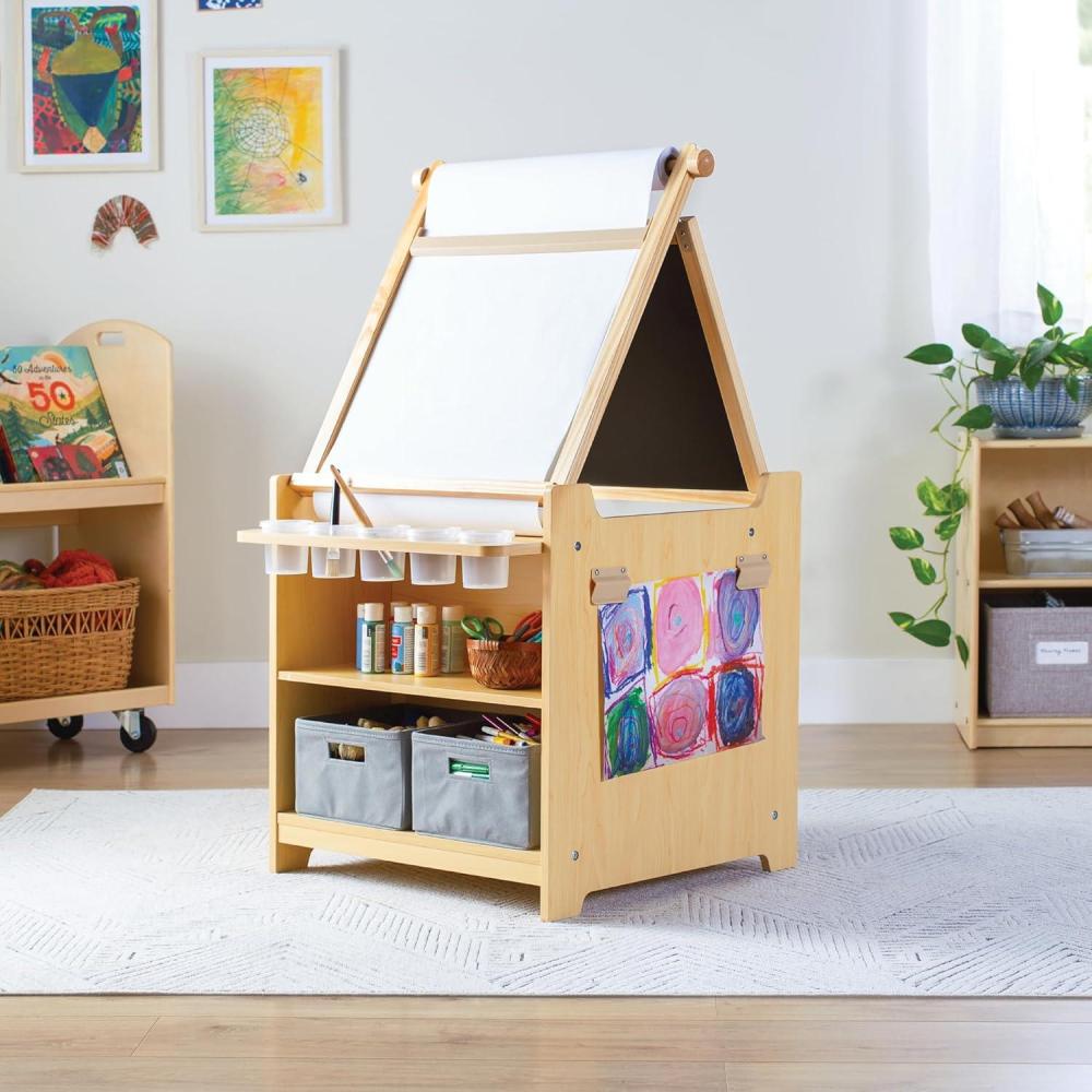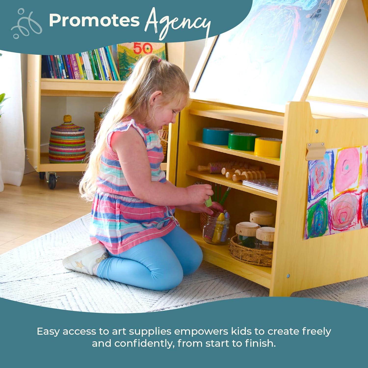 ART PAPER MANAGEMENT SYSTEM TO ENCOURAGE CHILD AGENCY: Features an integrated paper roll dispenser and a built-in child-safe paper cutter, giving kids the freedom to access, tear, and manage their own materials—encouraging independence and creativity as they work.