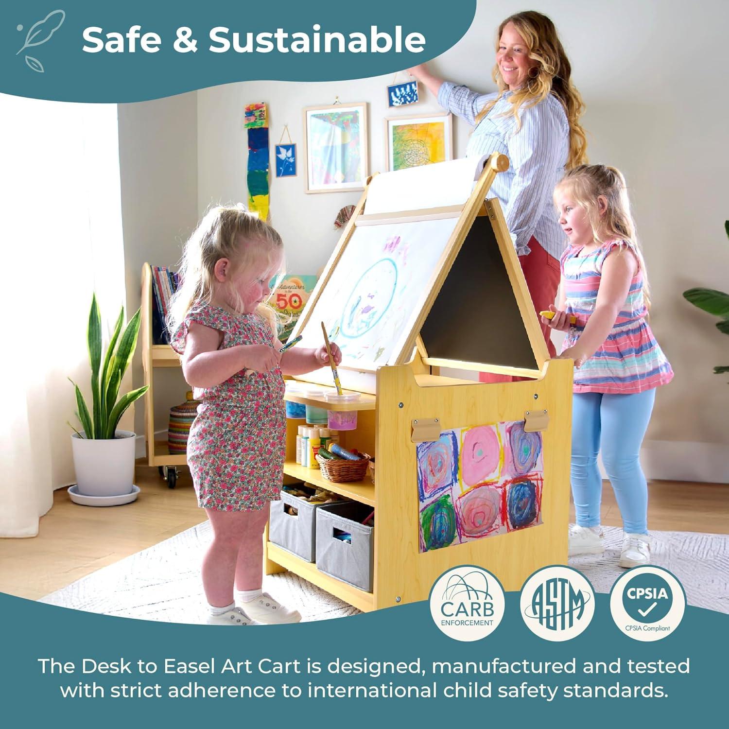 3-IN-1 KIDS ART CART FOR PLAYROOMS, CLASSROOMS, AND HOMESCHOOL SPACES: This multifunctional art cart features a double-sided easel with a chalkboard on one side and a write-on/wipe-off surface on the other. It easily locks into an upright easel position or folds down flat to become a spacious desk—perfect for drawing, crafting, and creative exploration.