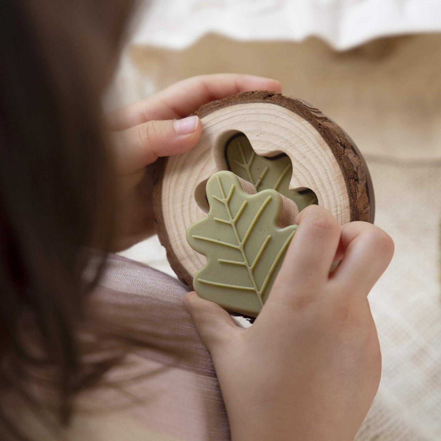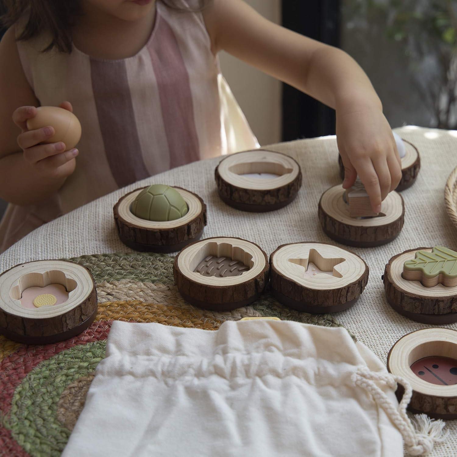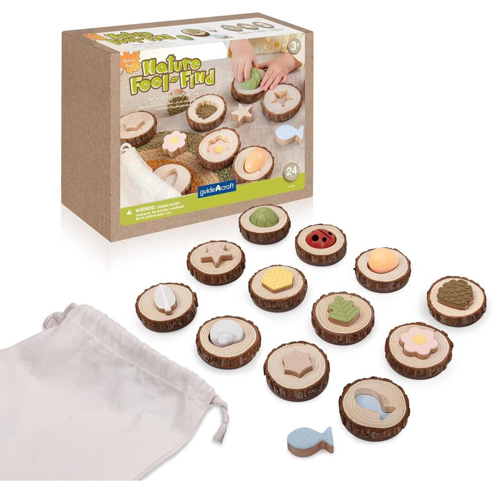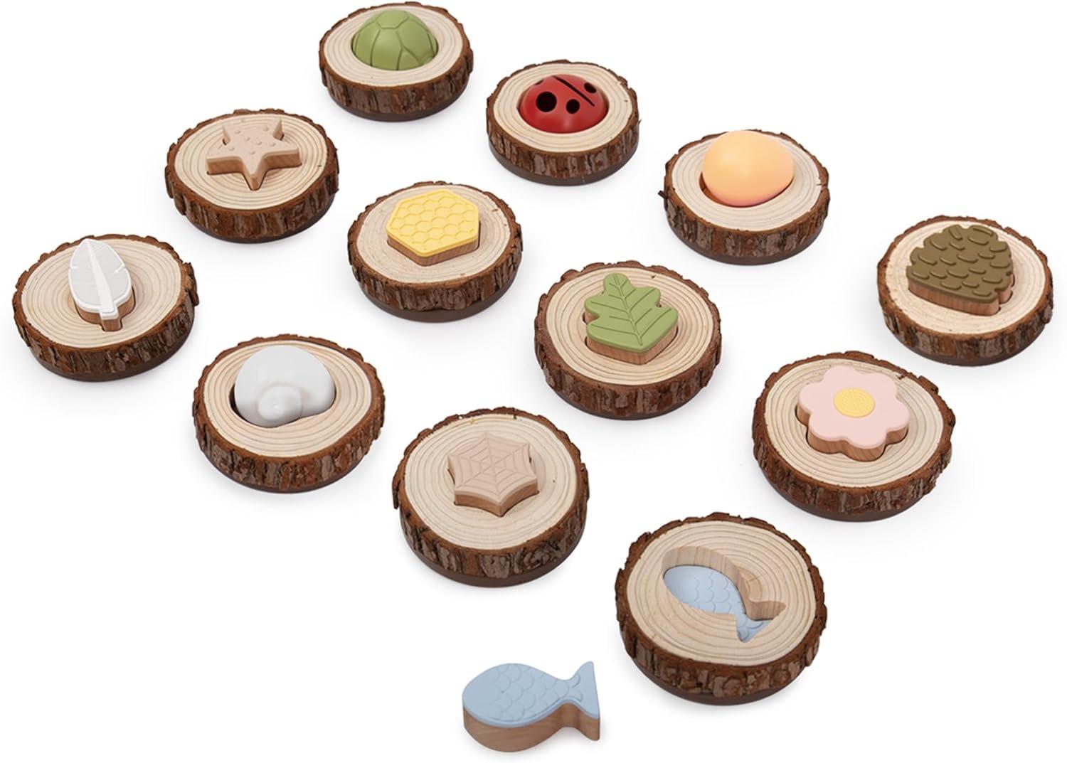 Children 3 and up will engage their senses and strengthen their memory while playing this elevated, nature-inspired version of a classic matching game. Pieces representing flowers, spider webs, ladybugs, turtle shells, eggs, pine cones and other naturally occurring materials that children already relate to the outdoors, allow for easy recognition and recall during play. Over-sized, wood cookie bases will naturally wear over time, revealing cause and effect behaviors and natural evolution to children. Set includes 24 pieces and canvas bag to use during playtime and after as storage.