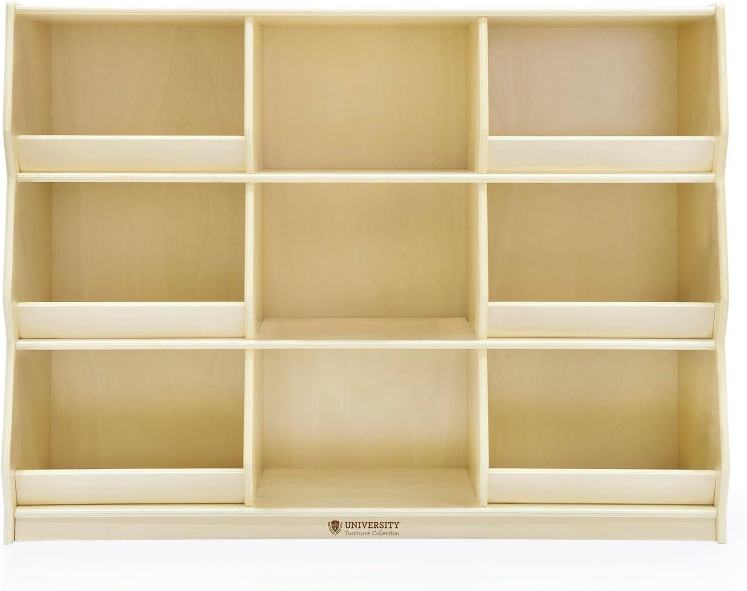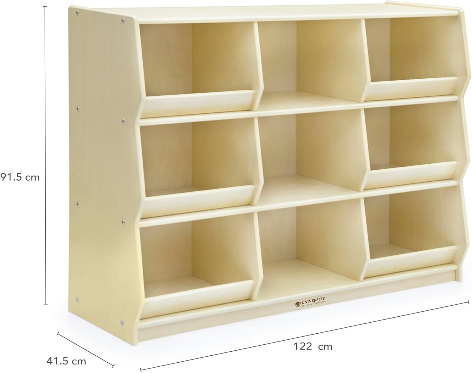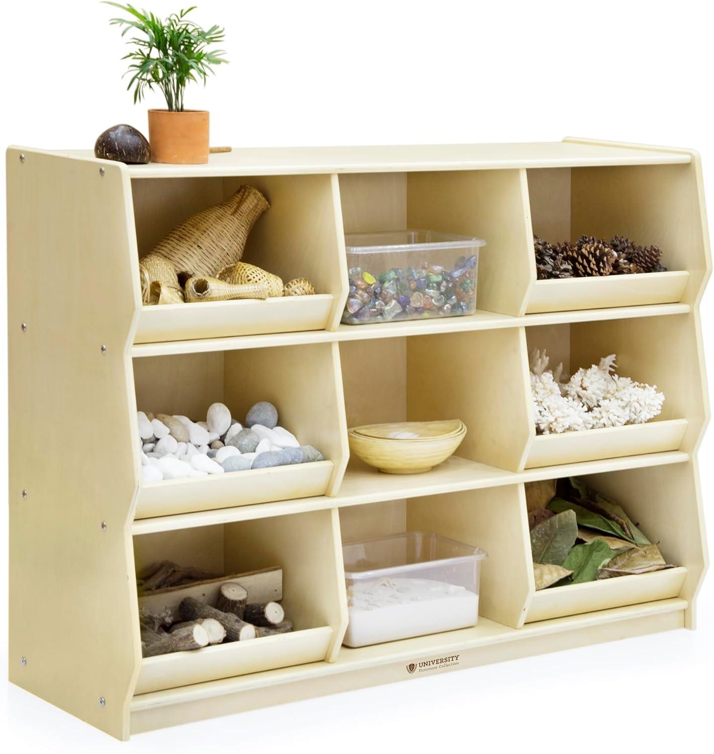 9 bin-style compartments keep manipulatives and wheeled toys contained and organized