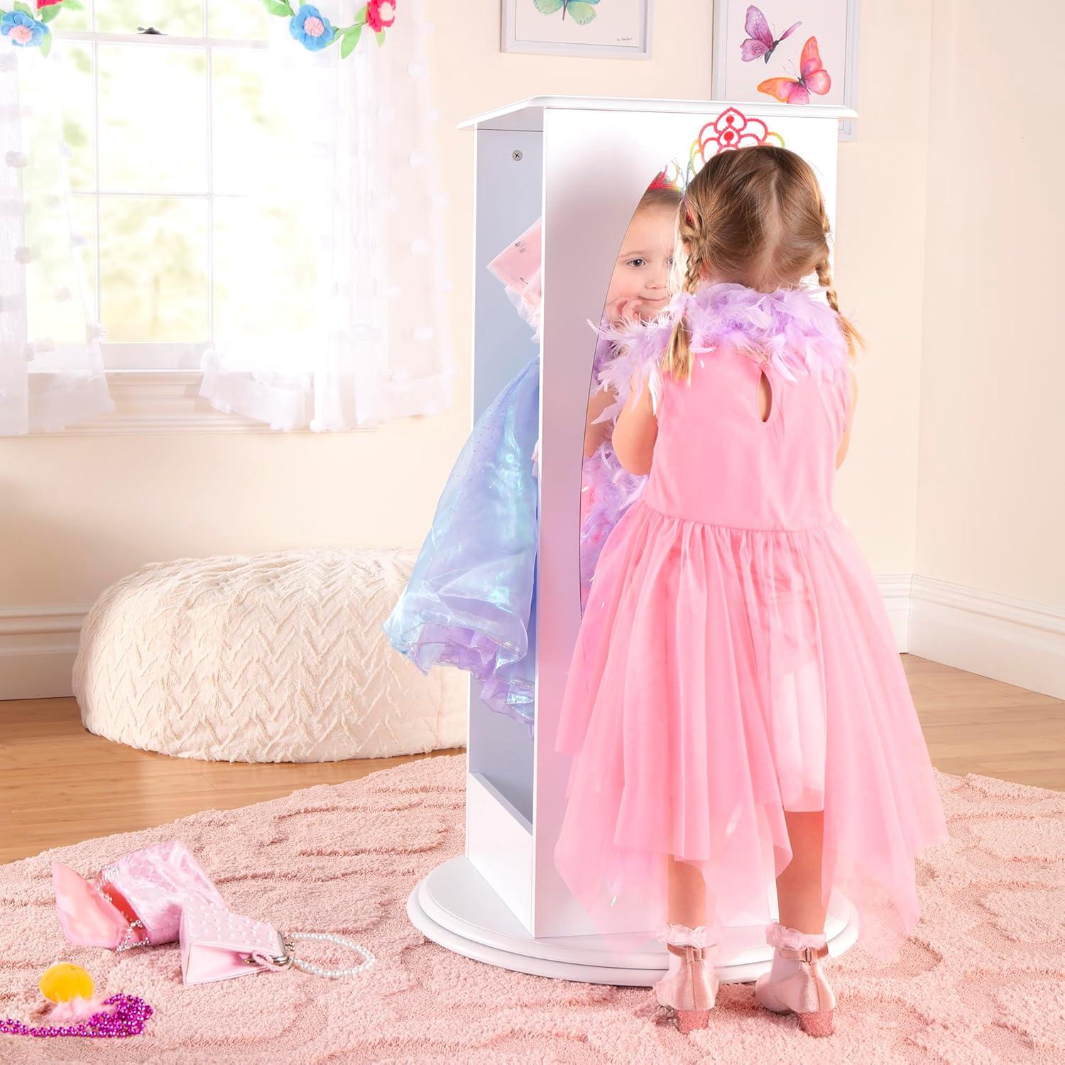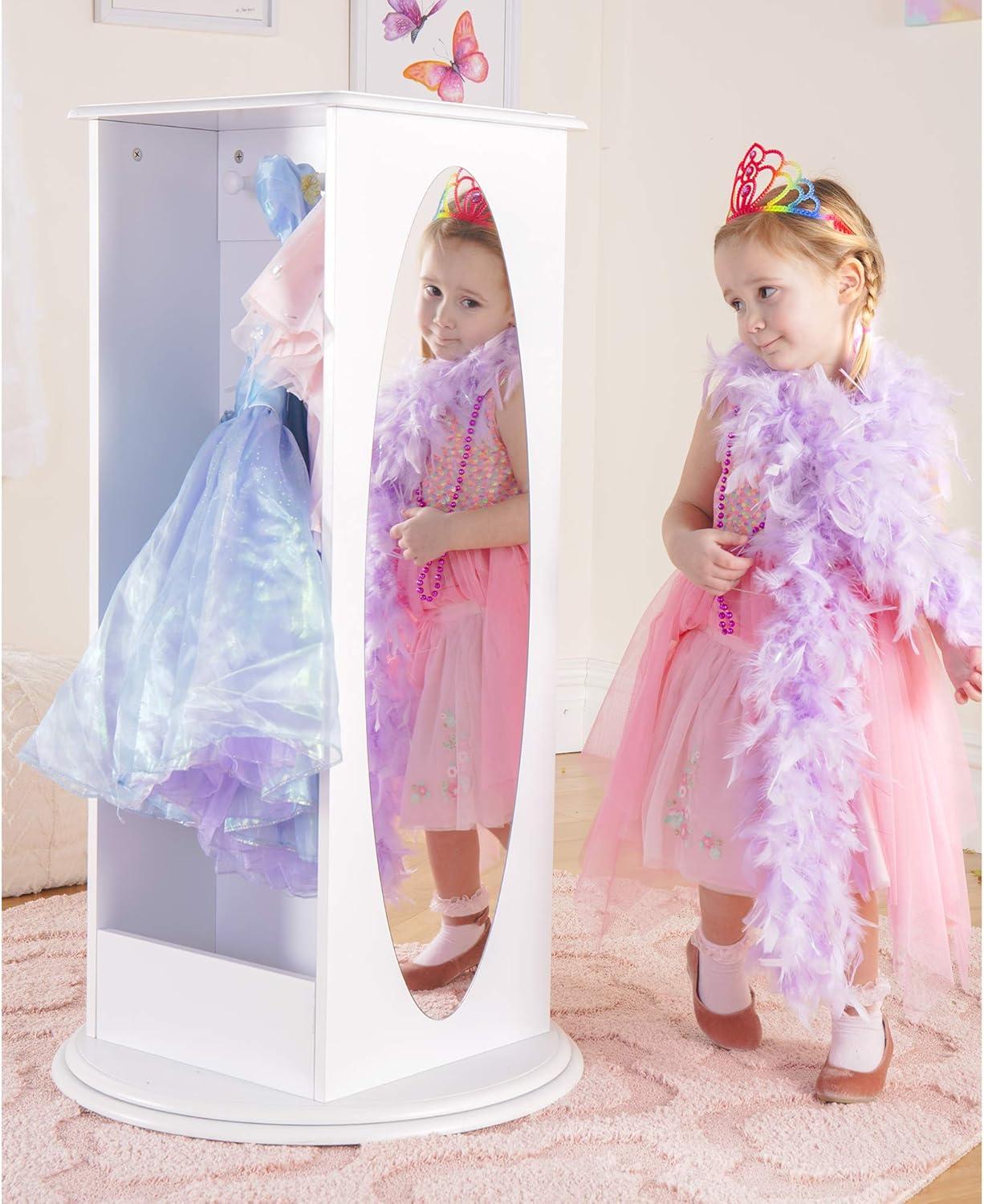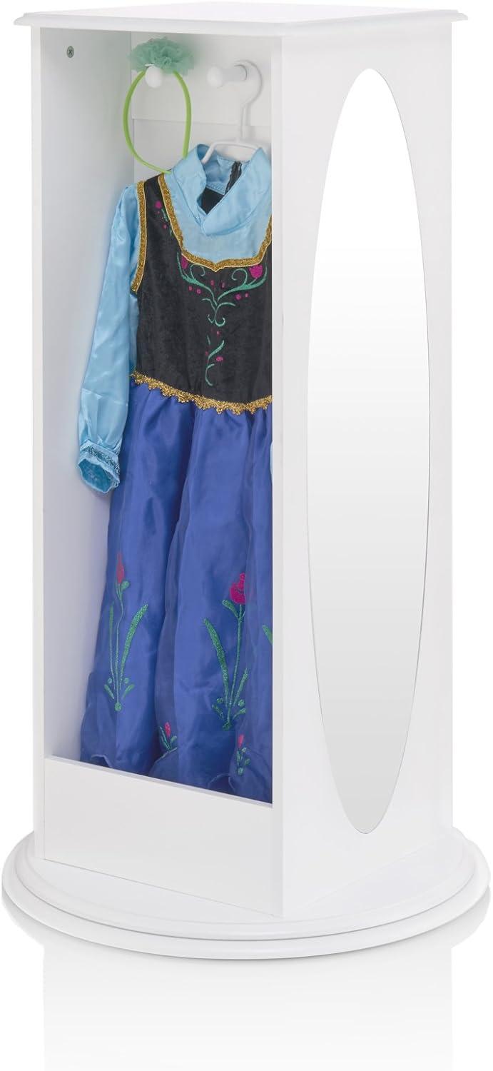SPACIOUS, ROTATING STORAGE SPACE FOR KIDS' COSTUMES AND MORE: The two-sided space easily accommodates all your child’s favorite outfits on one side, while five compartment shelves on the other are perfect for shoes, purses and crowns. Children rotate the wooden unit to easily access all of their dress up accessories.