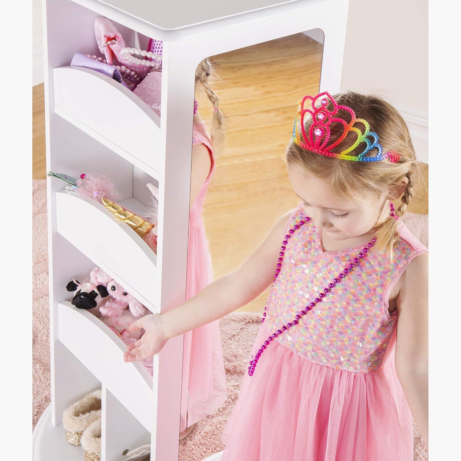 PROMOTE INDEPENDENCE: Encourage independence as they pick out what to wear, observe themselves in the mirror and put their clothes away in the right spaces. Simply fill the Rotating Dress Up Storage with your child’s favorite dress up clothes and accessories.