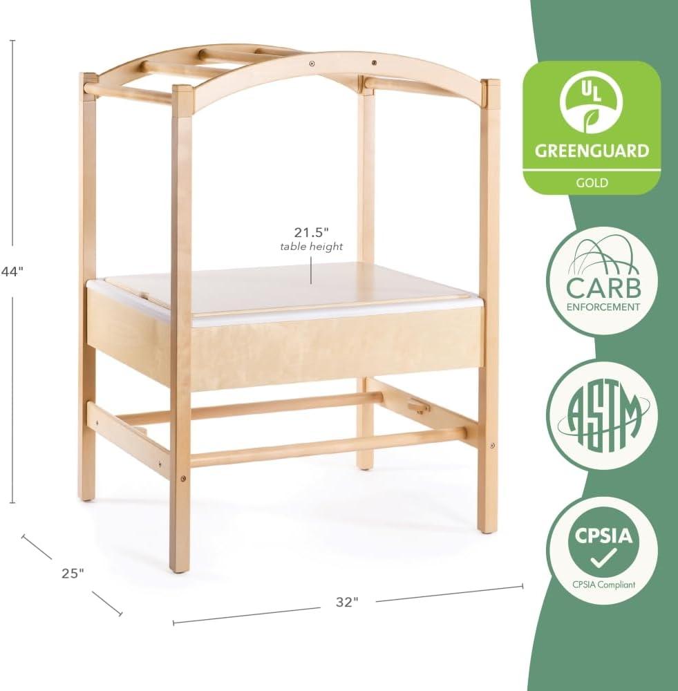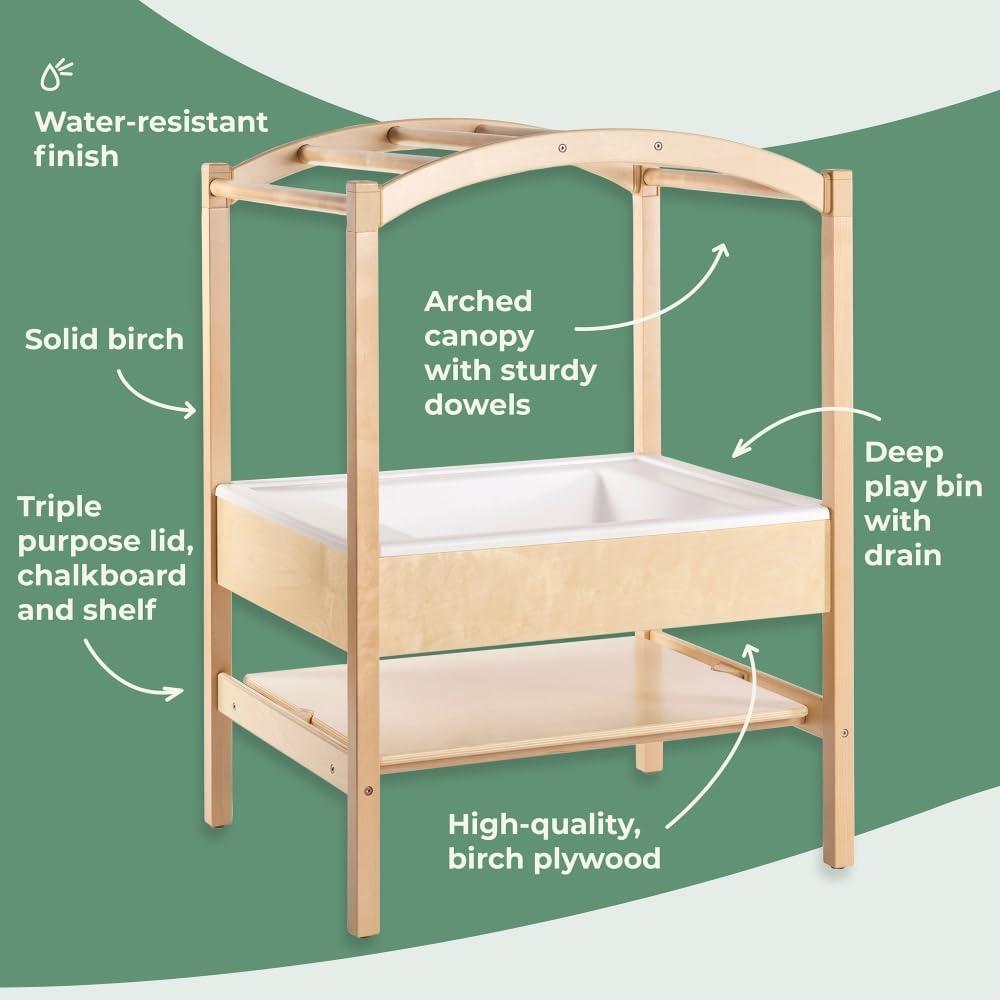WATER-RESISTANT WOOD TABLE FOR WET AND DRY ACTIVITIES: The Sensory Table System and canopy are made from Greenguard Gold Certified solid birch wood and birch plywood and coated with a water-resistant coating, making the entire unit durable enough for indoor or outdoor activites (store indoors when not in use)