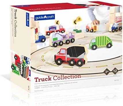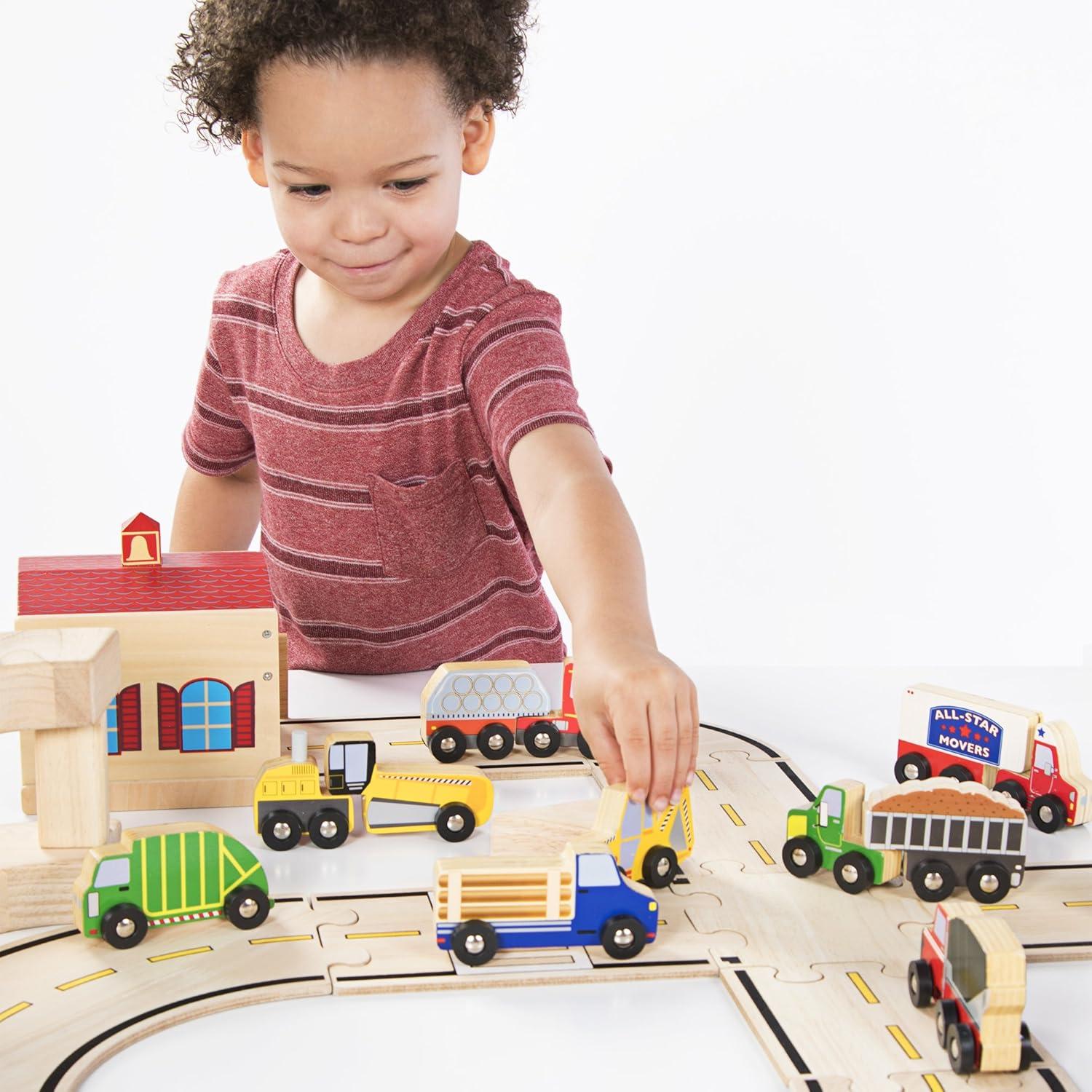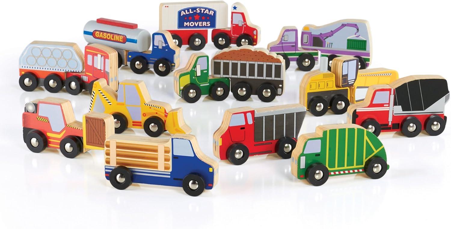 Set of 12 wooden vehicles featuring a cement mixer, backhoe, sanitation truck, moving truck and more for ages 2+