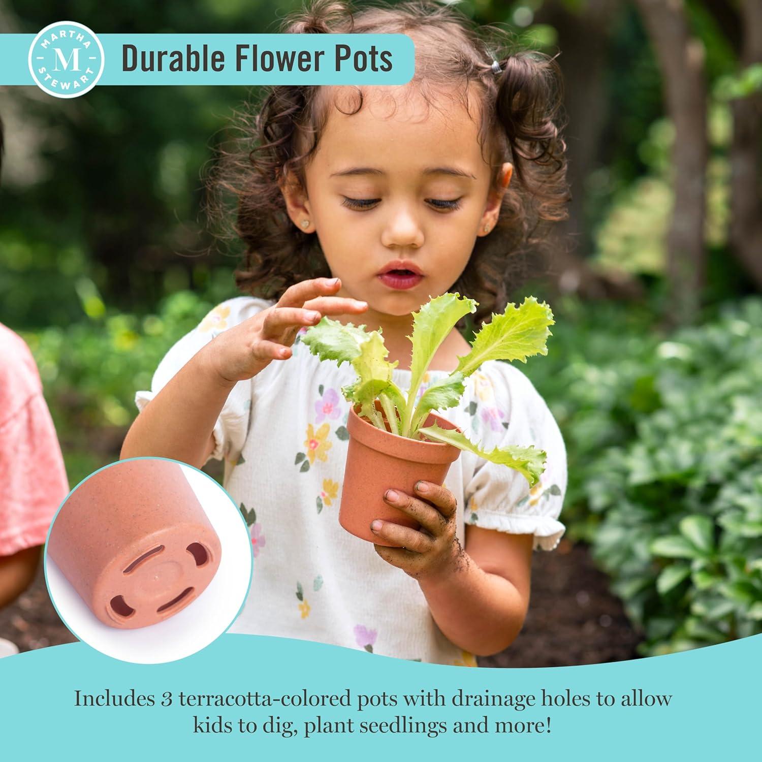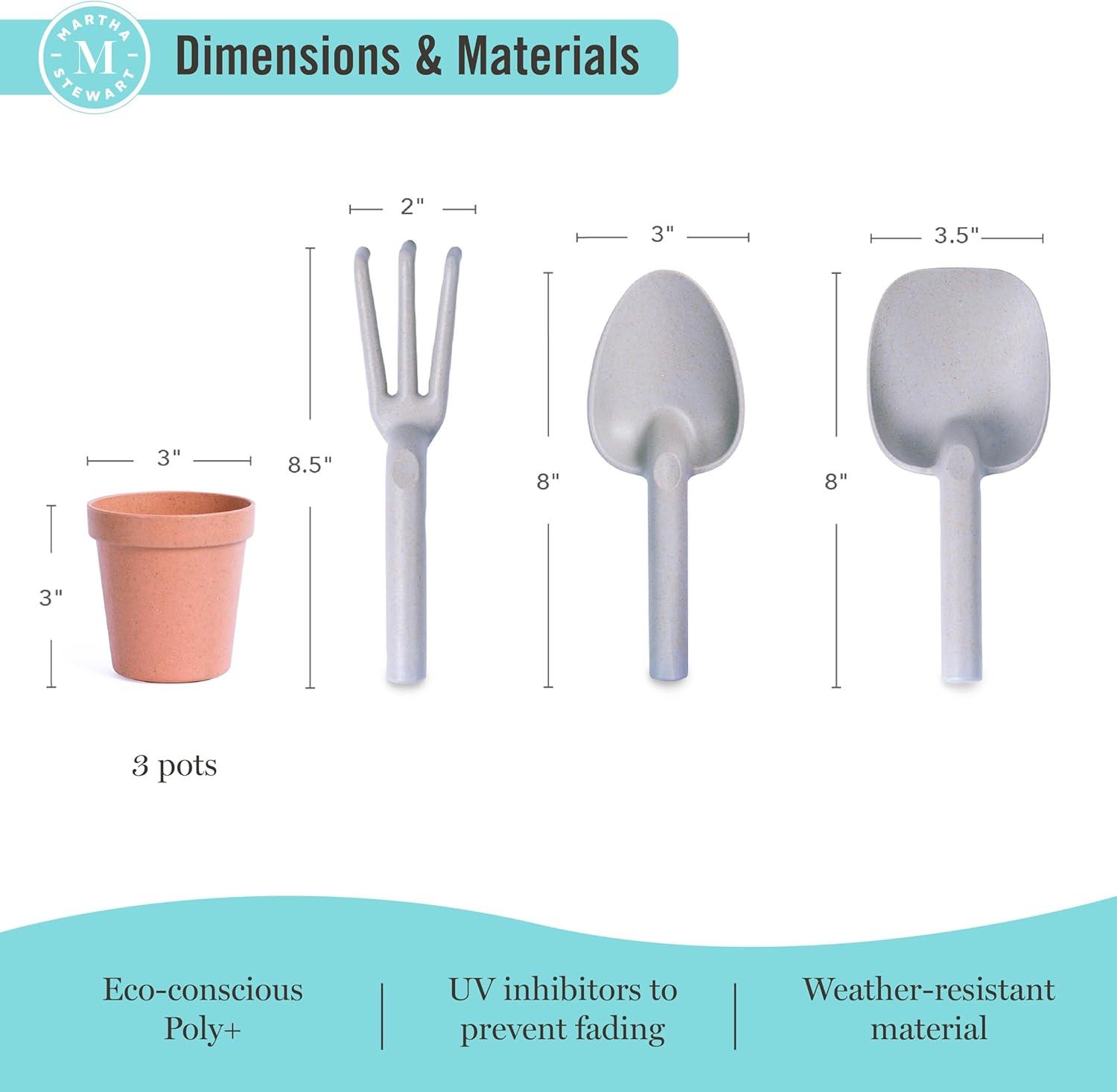 MARTHA STEWART KIDS OUTDOOR GARDENING TOOLS & POTS: The set includes a child-sized rake, trowel, and shovel made from lightweight yet durable Poly+ material, specially sized and shaped for little hands to dig, scoop, and plant with confidence.