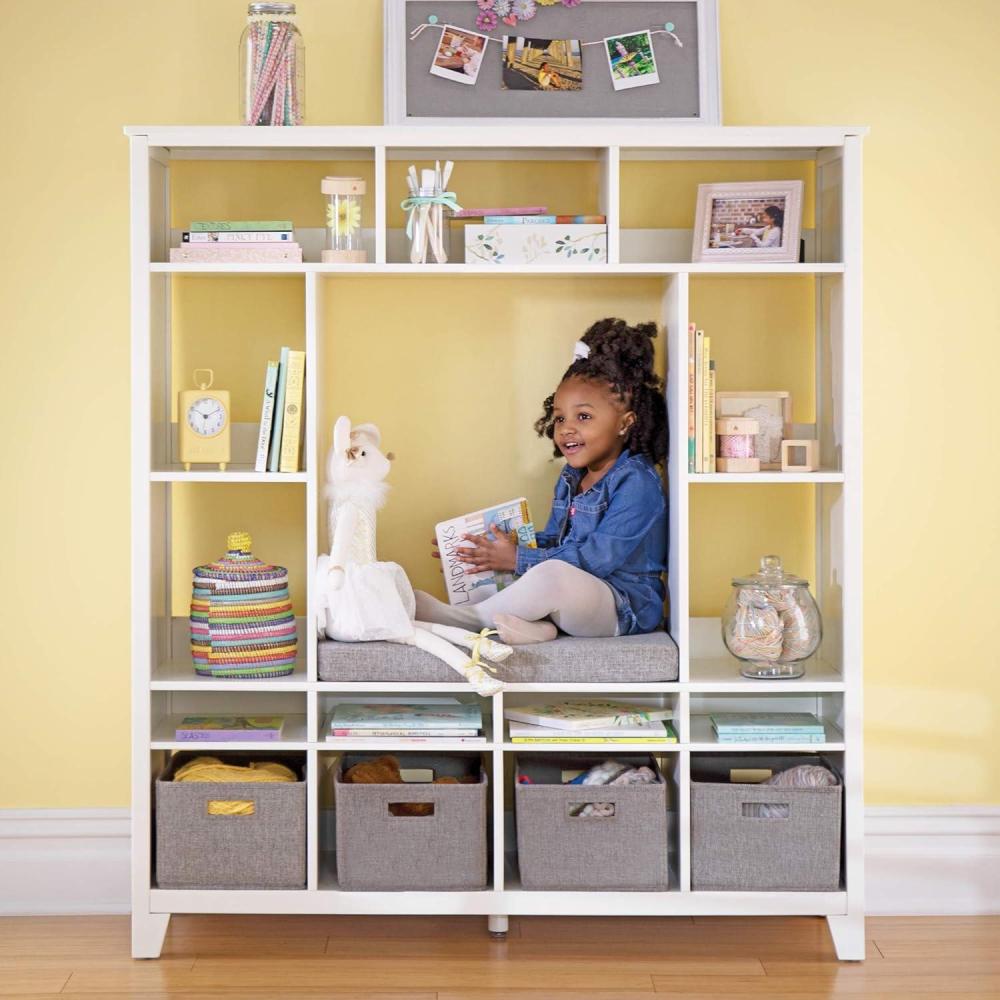 Martha Stewart Kids' Storage System (Gray) – Wood Bookshelf Cubby with Seat Cushion, Shelves and Storage Bins; Reading Nook Bookcase and Kids Room Bench(Linen White)